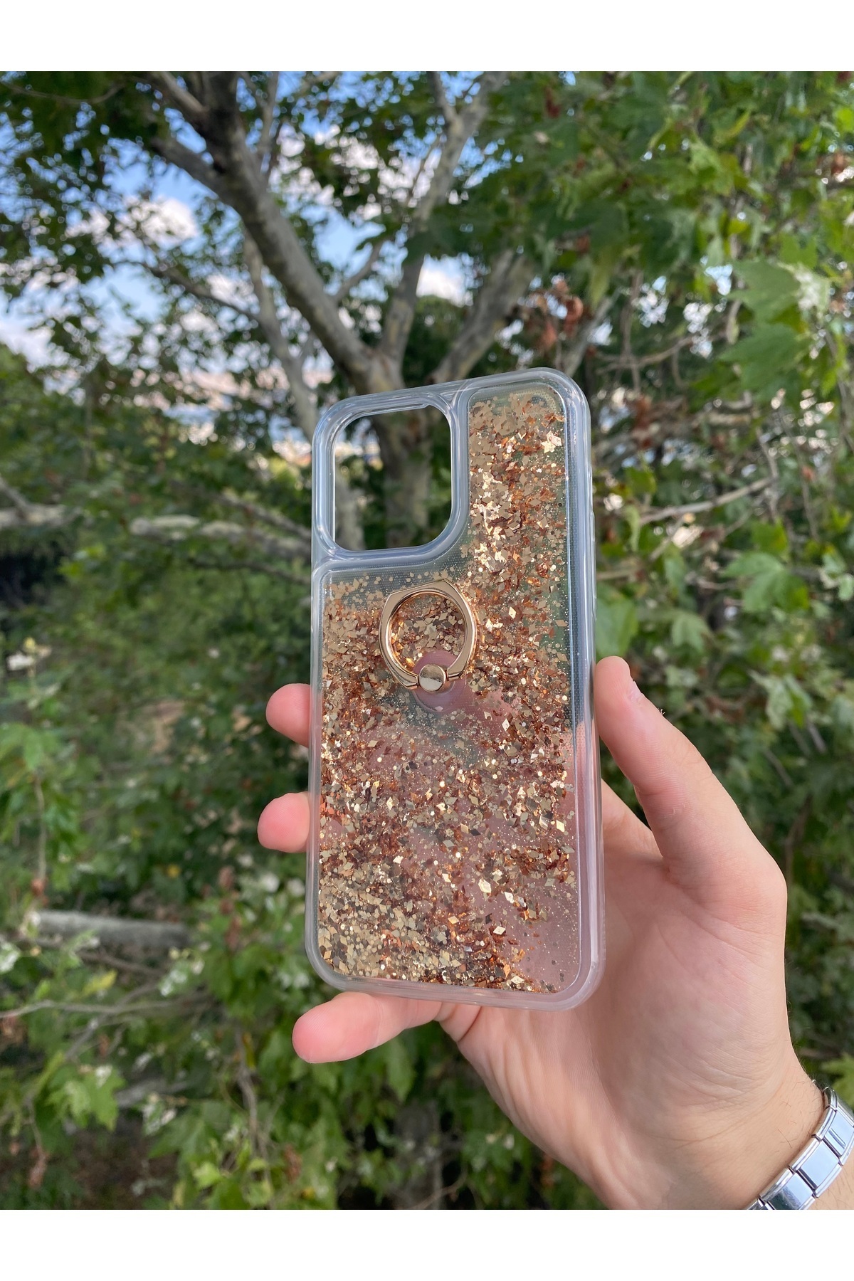 Apple iPhone 13 Pro Max Uyumlu Sulu Simli Yüzüklü Standlı Parlak Silikon Kılıf Gold Apple iPhone 13 Pro Max Uyumlu Sulu Simli Yüzüklü Standlı Parlak Silikon Kılıf Gold sulu13pm تک سایز