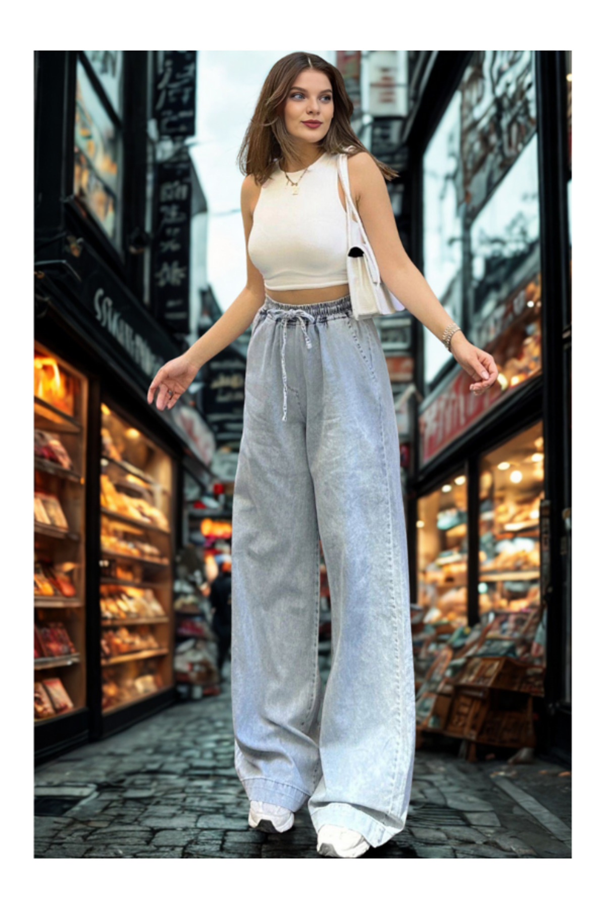Kadın Açık Mavi Beli Lastikli Bagcıklı Cepli Bol Paça Palazzo Kot Pantolon - Tesettüre Uygun Kadın Açık Mavi Beli Lastikli Bagcıklı Cepli Bol Paça Palazzo Kot Pantolon - Tesettüre Uygun BELİLASTİKLİ 44