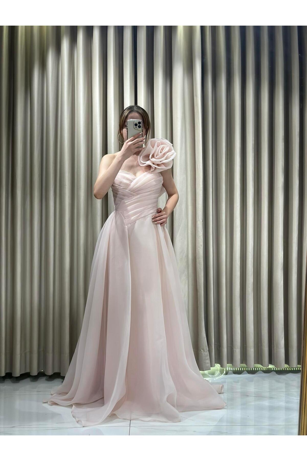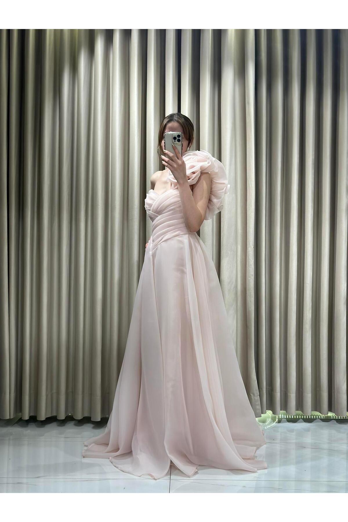 Pudra Tek Omuz Kloş Tül Abiye 5161 Pudra Tek Omuz Kloş Tül Abiye 5161 HT5161 42