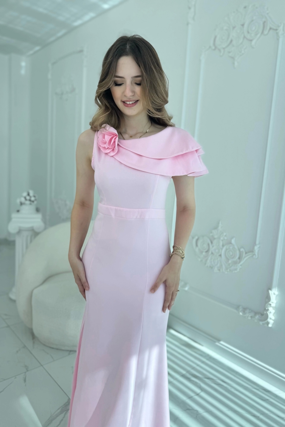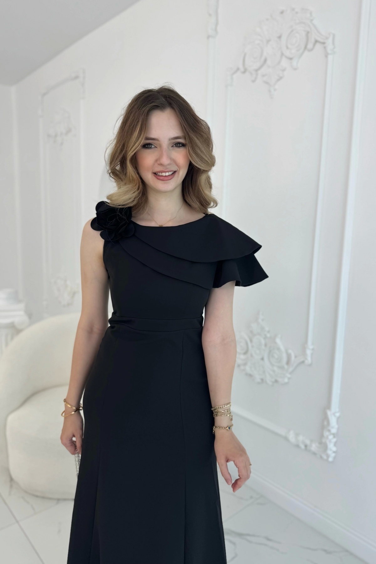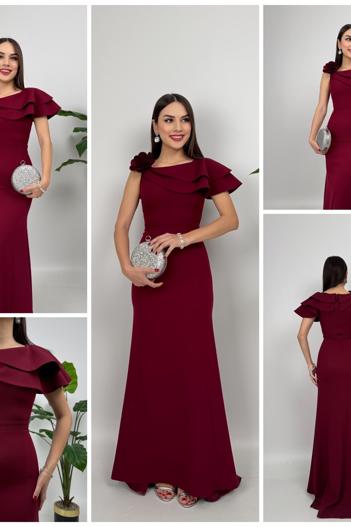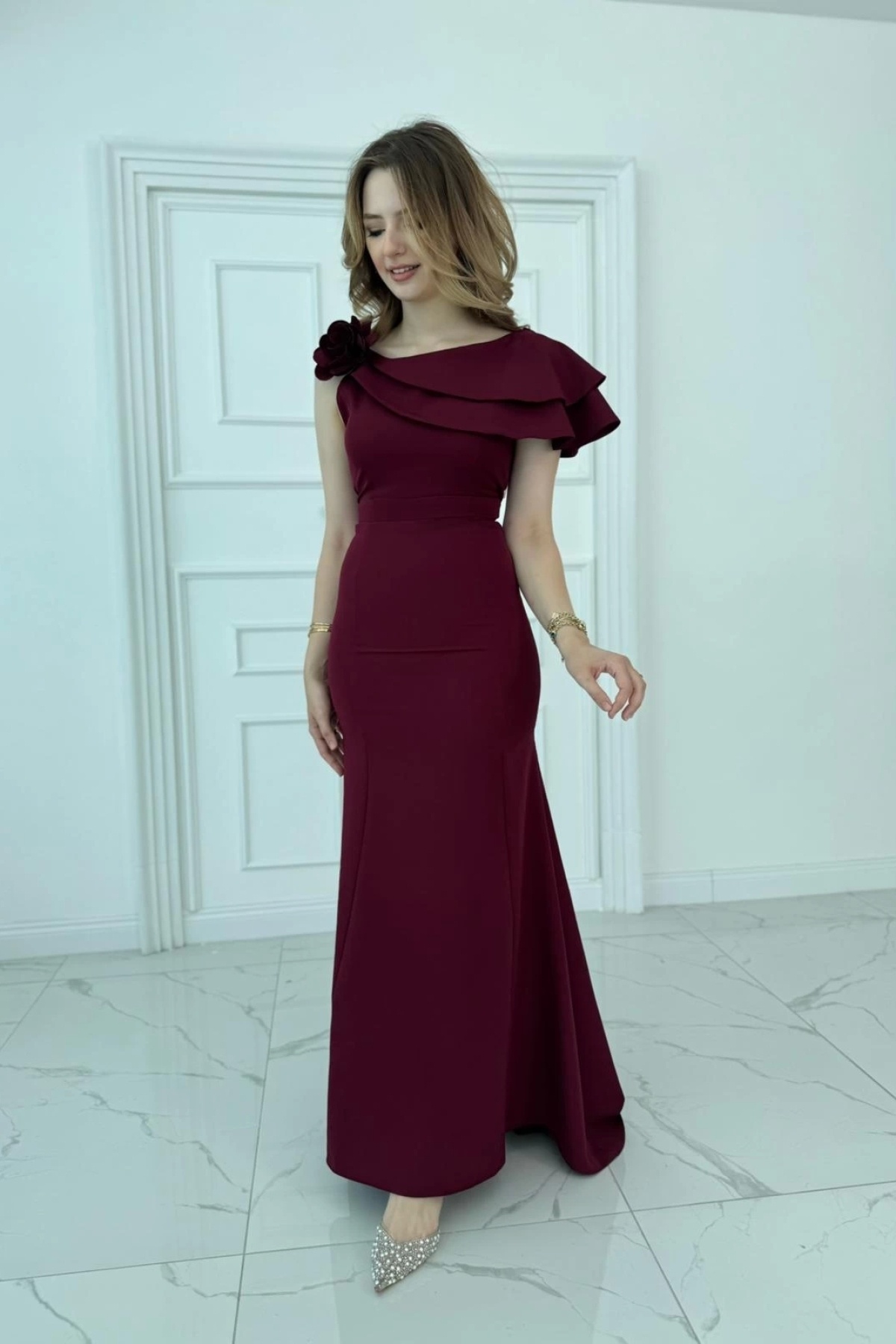 Asimetrik Volan Detaylı Bordo Tek Omuzlu Abiye Elbise Asimetrik Volan Detaylı Bordo Tek Omuzlu Abiye Elbise 3025 XL