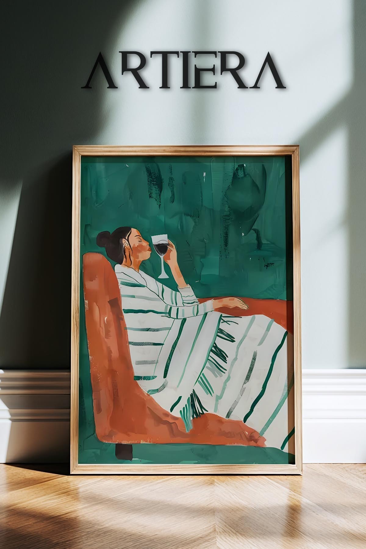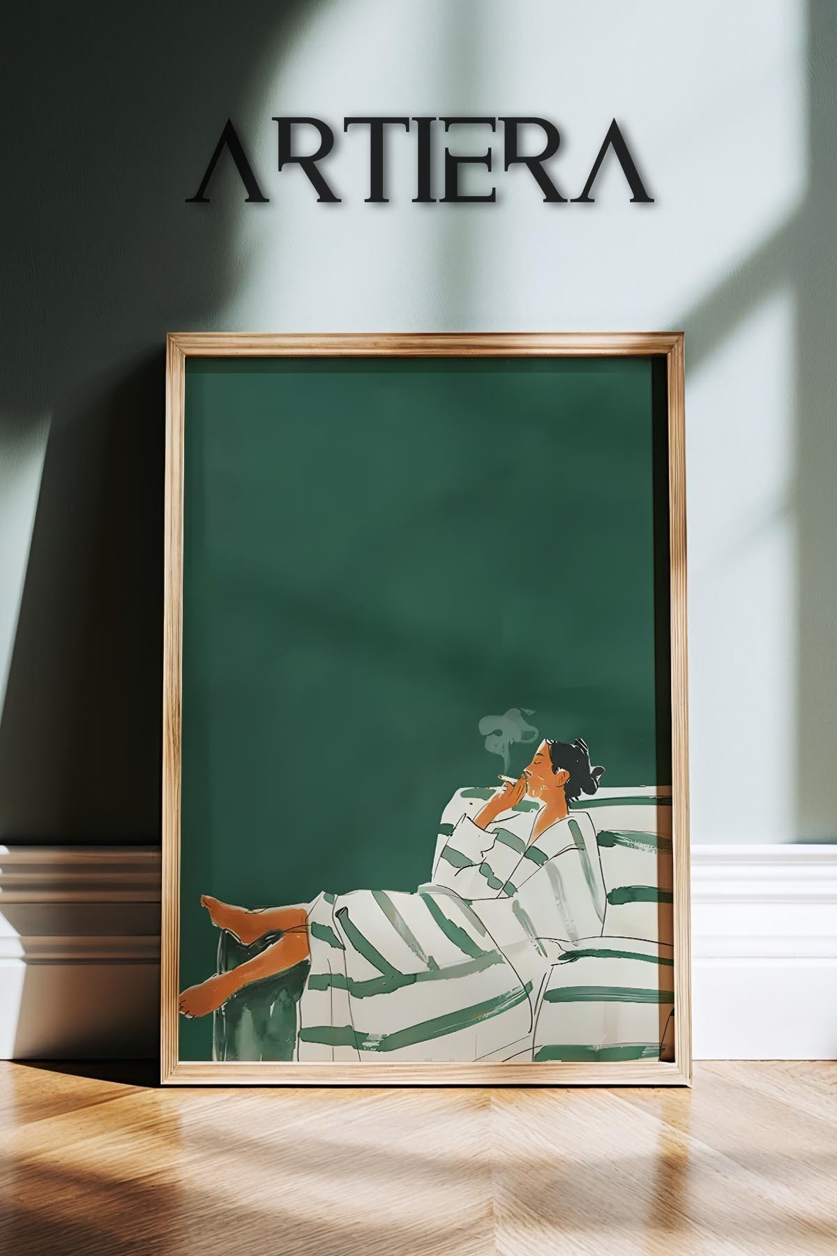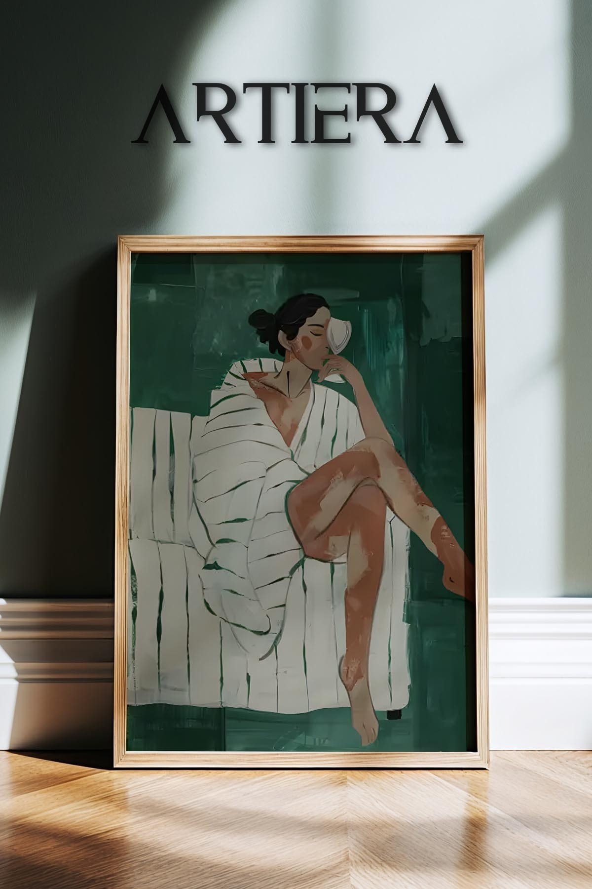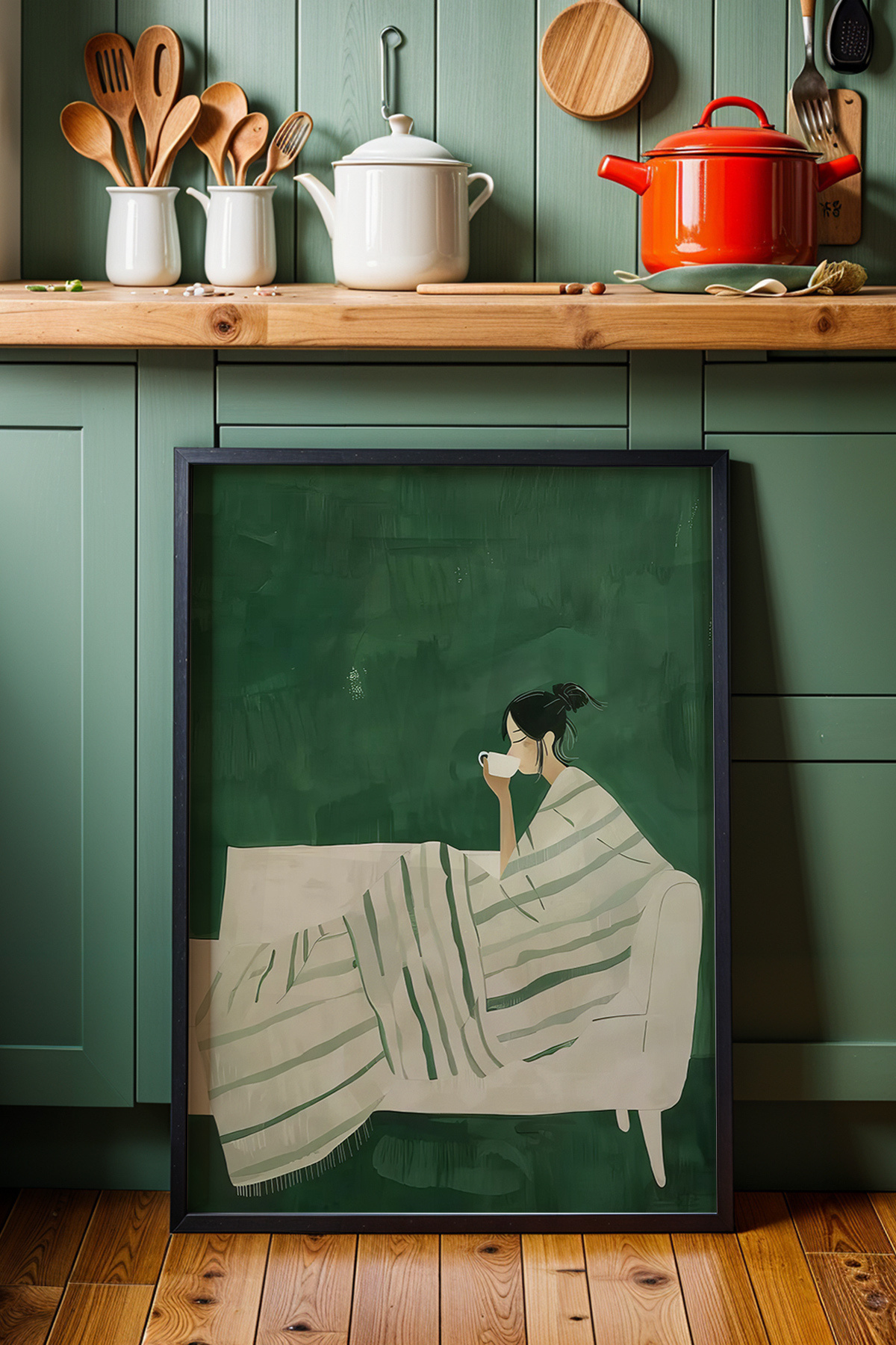 Sade Yeşil Tonlarda Kahve Keyfi Kadın Figürlü KTB Doğal Ahşap Çerçeveli Mutfak Duvar Tablosu Sade Yeşil Tonlarda Kahve Keyfi Kadın Figürlü KTB Doğal Ahşap Çerçeveli Mutfak Duvar Tablosu NOİR-1L-1212 50 x 70