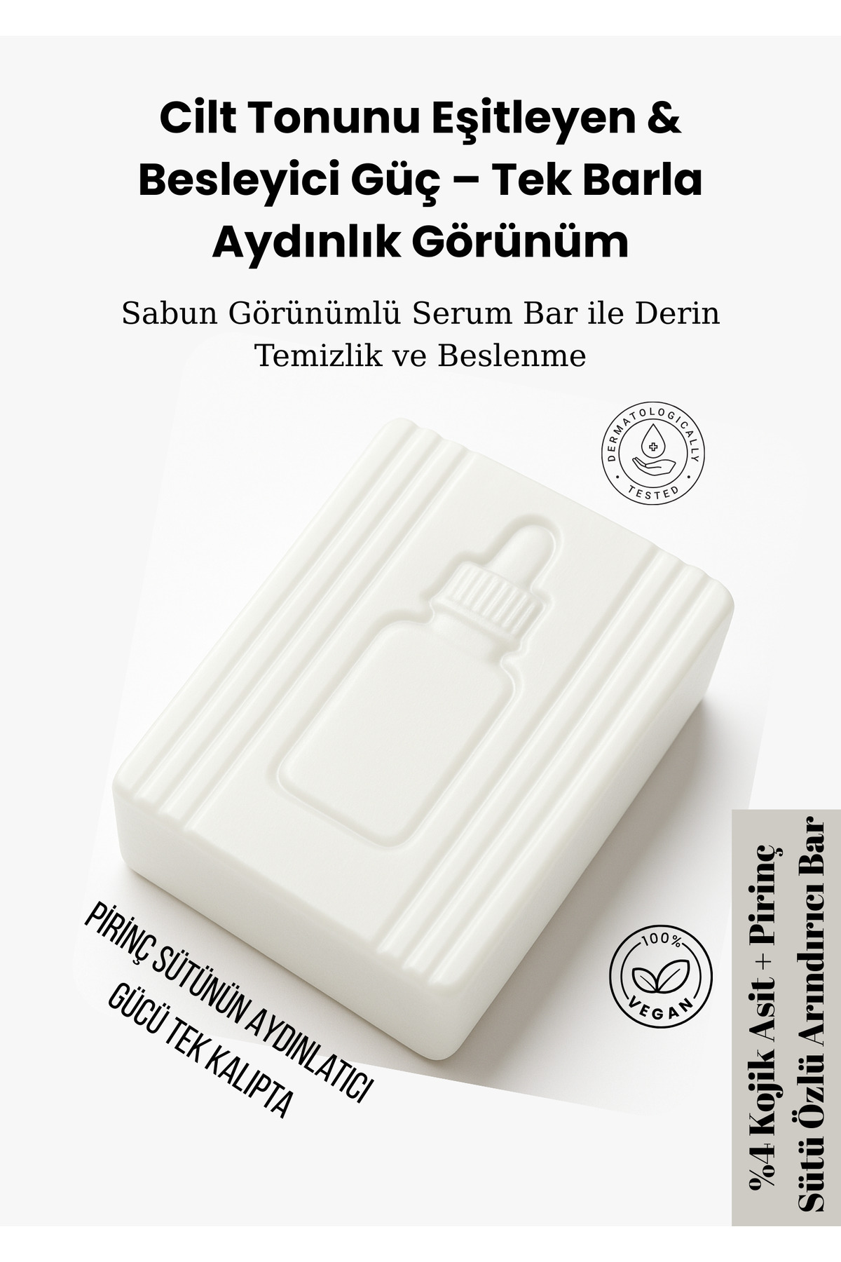 - Diğer Özellikler : %4 Kojik Asit ve Pirinç Sütü ile formüle edilmiştir Cilt tonunu eşitlemeye ve leke görünümünü azaltmaya yardımcı olur Doğal kabak lifiyle nazik peeling etkisi sağlar Aloe vera ile cildi nemlendirir ve yatıştırır Sabun formunda pratik ve ekonomik kullanım Paraben, sülfat ve sert kimyasallar içermez Tüm cilt tiplerine uygundur Düzenli kullanımda daha parlak ve sağlıklı bir cilt görünümü desteklenir