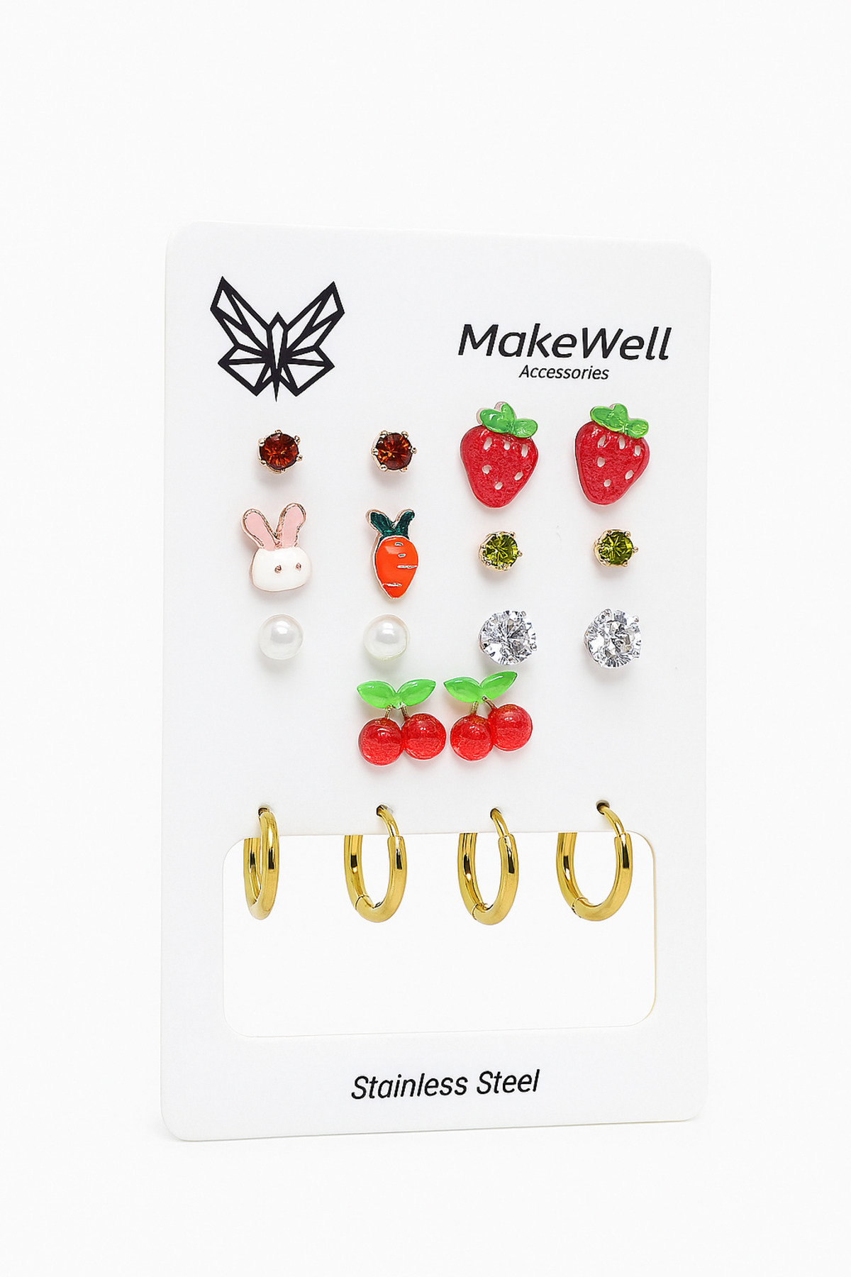 Çilek Kiraz Havuç ve Tavşan Tasarımlı Zirkon İnci ve Çelik Halka Küpeli 9'lu Küpe Seti Çilek Kiraz Havuç ve Tavşan Tasarımlı Zirkon İnci ve Çelik Halka Küpeli 9'lu Küpe Seti KE2000,230 تک سایز