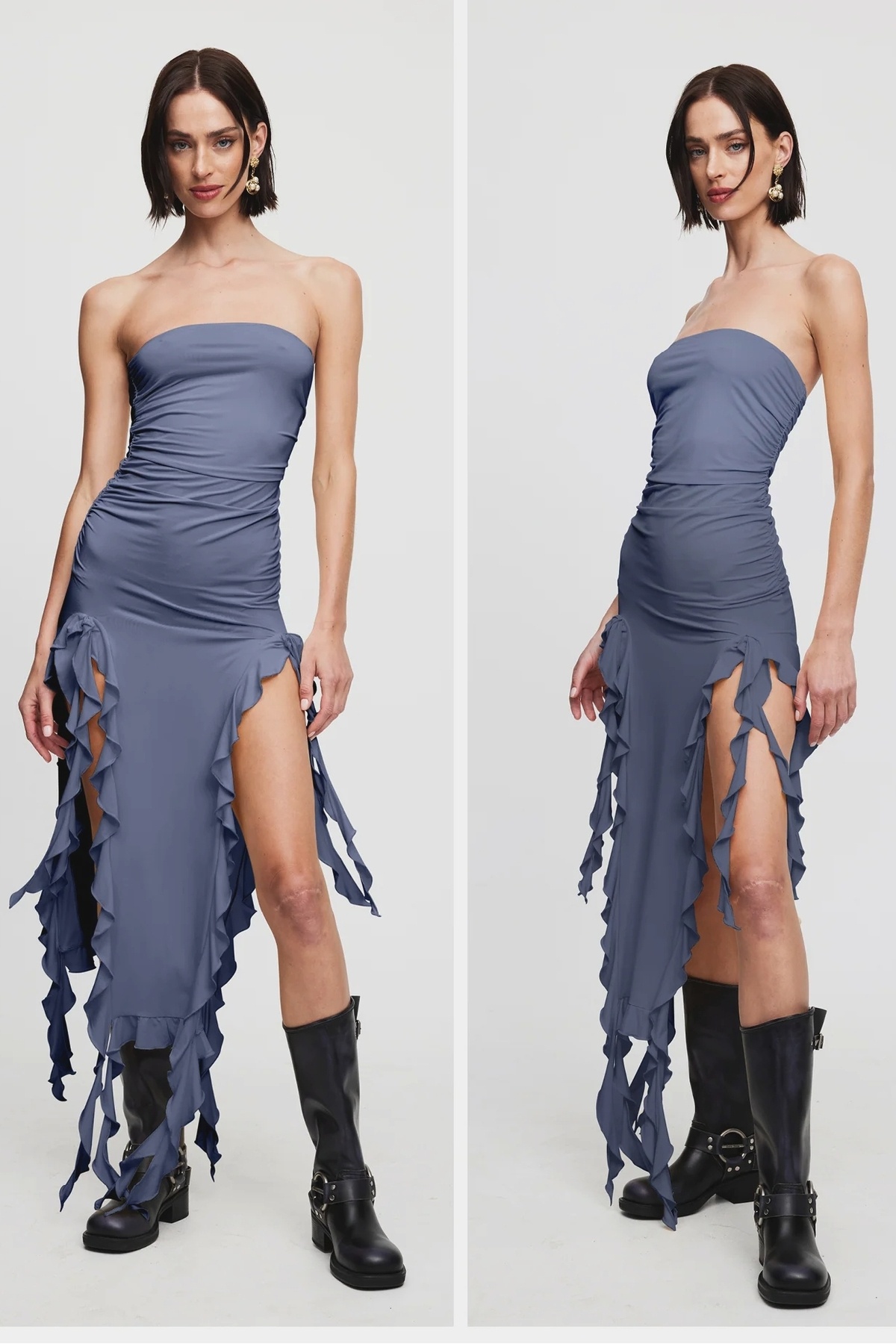 ÇİFT YIRTMAÇLI BÜZGÜLÜ ESNEK STRAPLEZ ELBİSE ÇİFT YIRTMAÇLI BÜZGÜLÜ ESNEK STRAPLEZ ELBİSE 3078 L