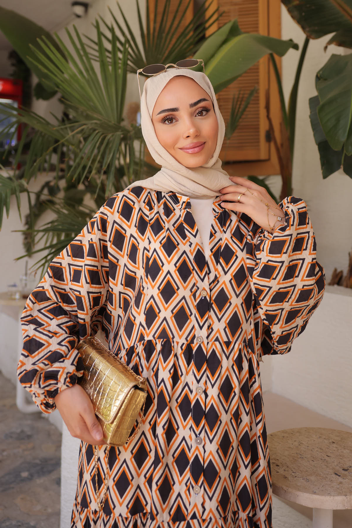 Bej Yarım Düğmeli Eteği Katlı Elbise Bej Yarım Düğmeli Eteği Katlı Elbise IMJ007304 تک سایز