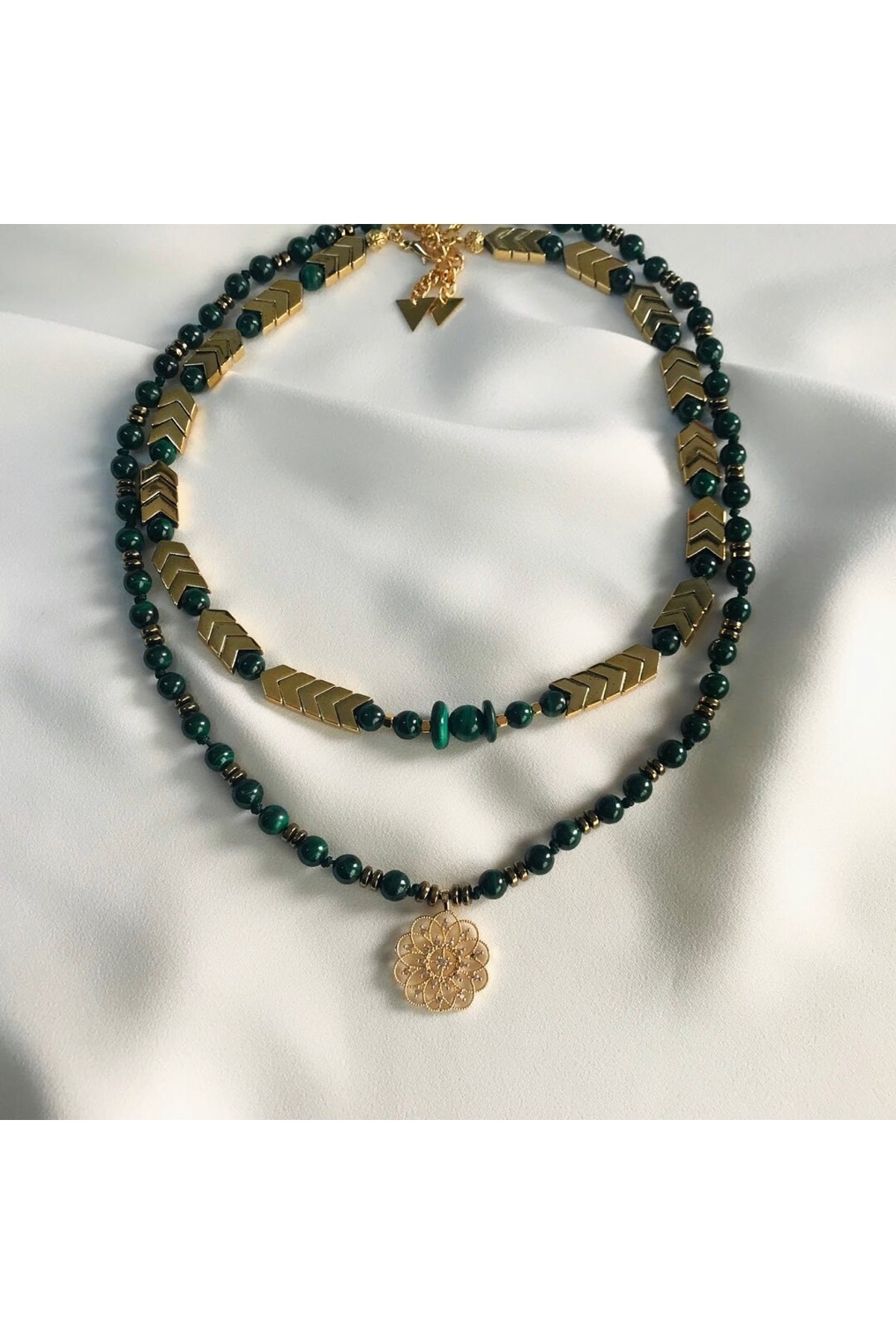 2358 Zümrüt Malahit Hematit el yapımı iki sıralı kolye 2358 Zümrüt Malahit Hematit el yapımı iki sıralı kolye 48 cm