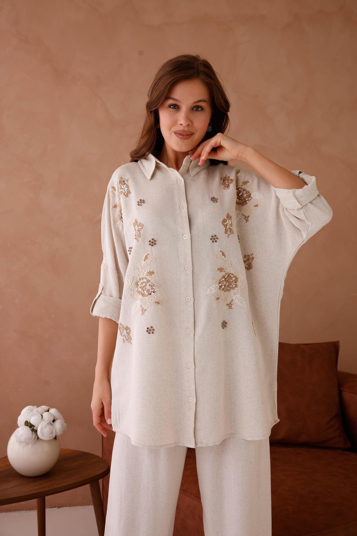 NAKIŞ İŞLEMELİ TAŞLI OVERSİZE KETEN TAKIM NAKIŞ İŞLEMELİ TAŞLI OVERSİZE KETEN TAKIM 117382 46-48