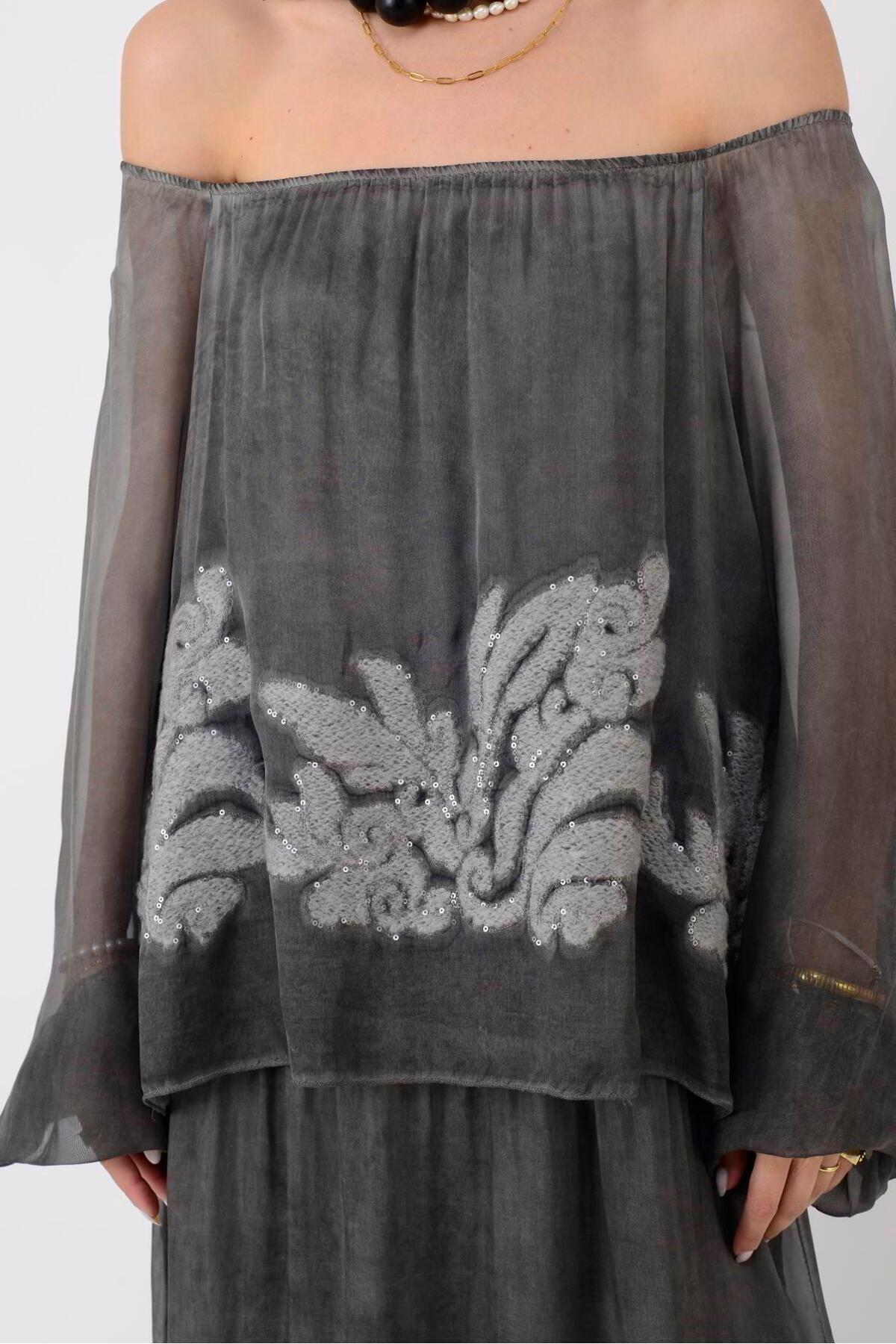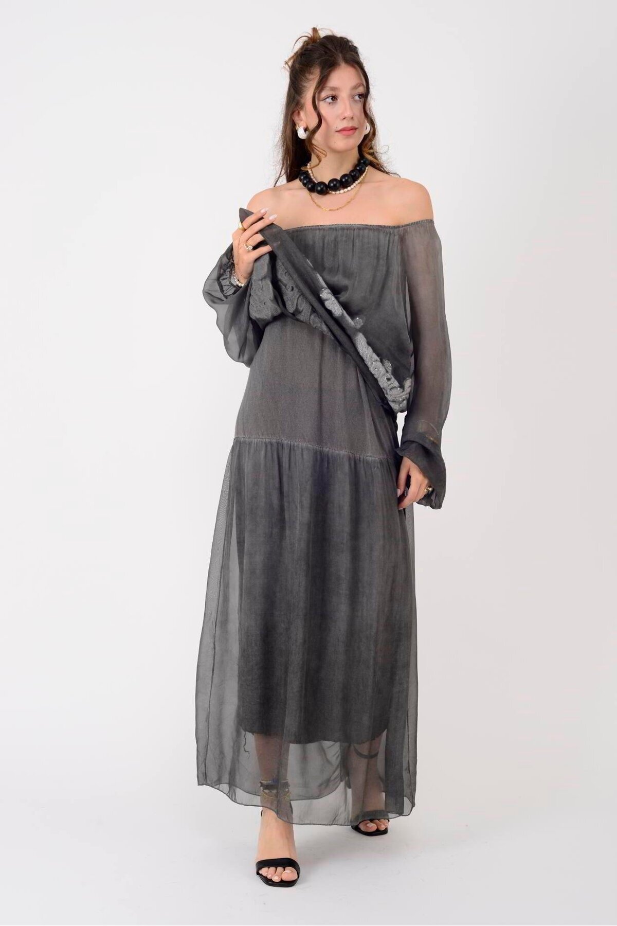 SN338 KABARTMALI PAYETLİ MADONNA YAKA İPEK ELBİSE SN338 KABARTMALI PAYETLİ MADONNA YAKA İPEK ELBİSE 25Y.T.ELB.00092-TAŞ 0
