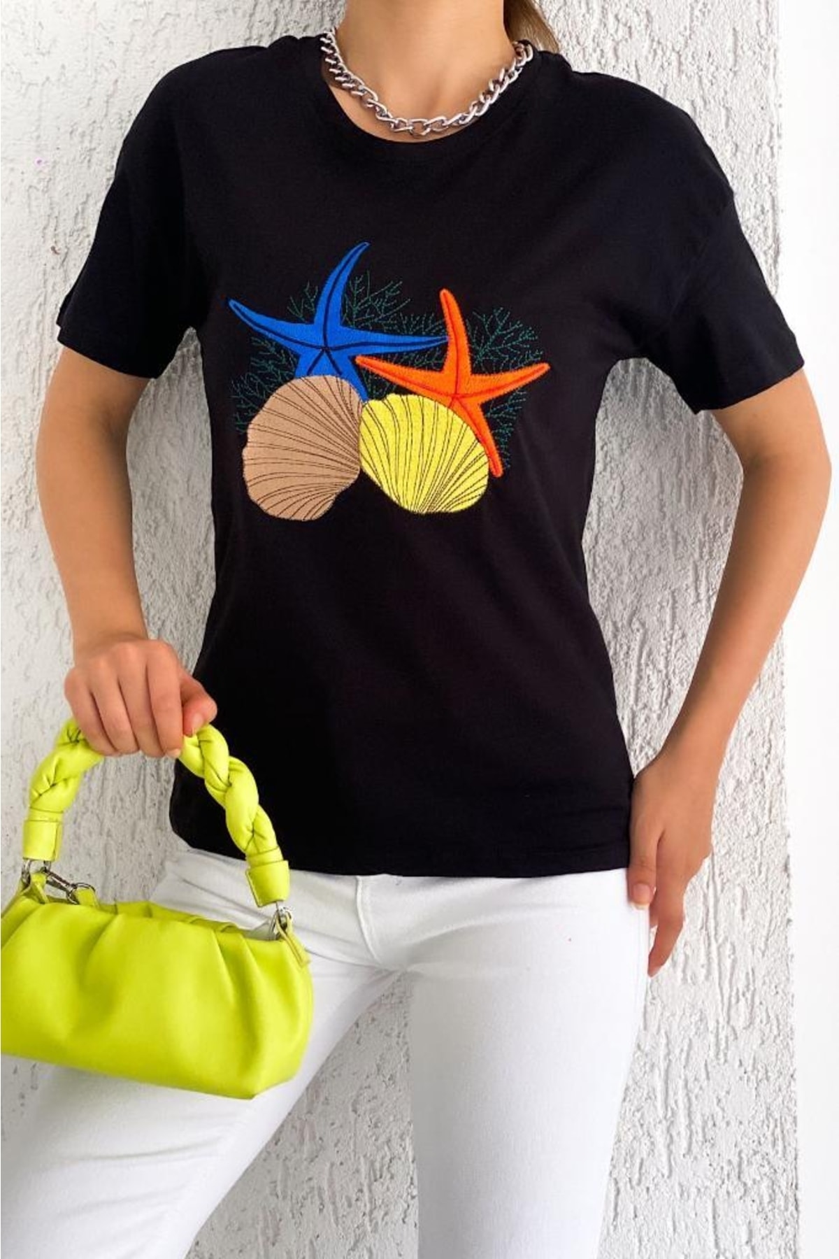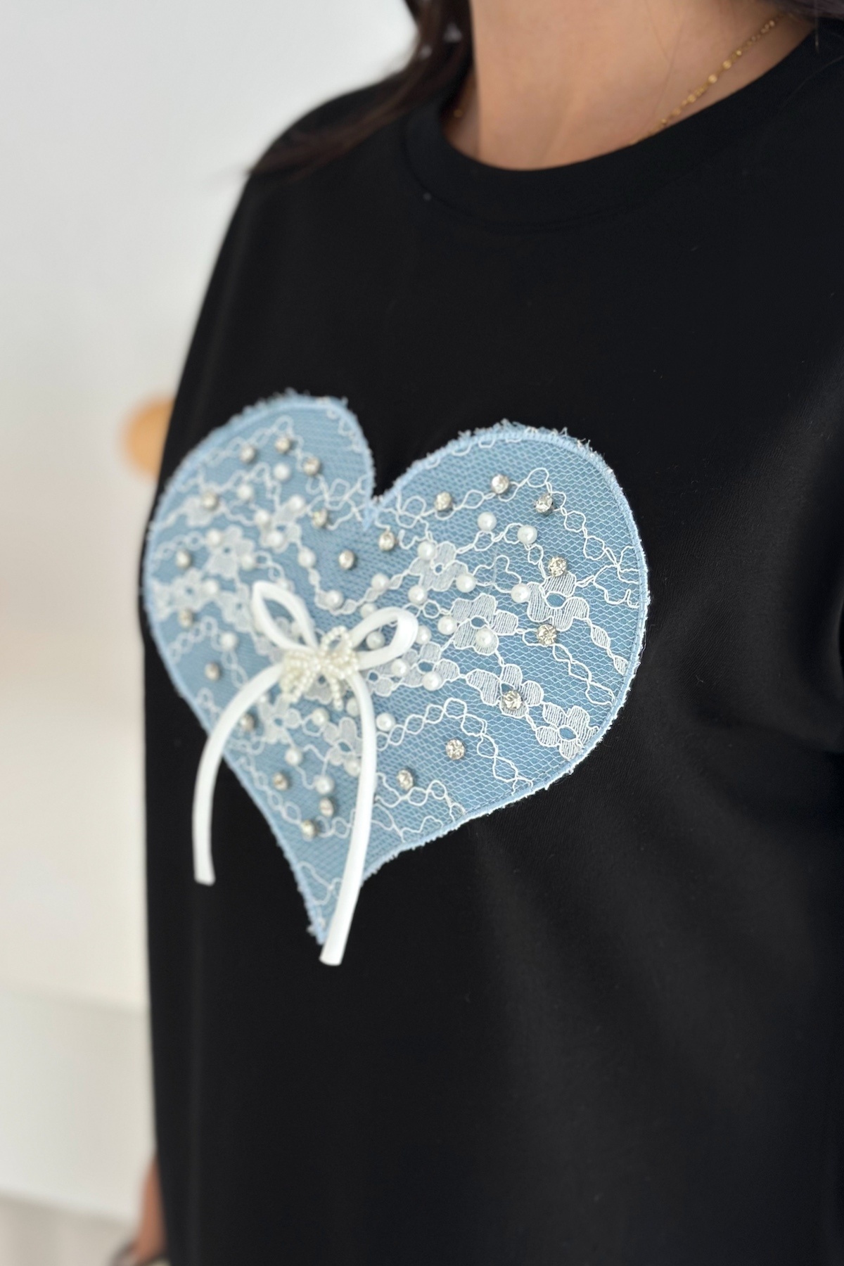Kadın Siyah Kurdele Kalp Desen Boncuk Ve Nakış İşlemeli Kot Detaylı %100 Pamuk Tişört Kadın Siyah Kurdele Kalp Desen Boncuk Ve Nakış İşlemeli Kot Detaylı %100 Pamuk Tişört T142 XL