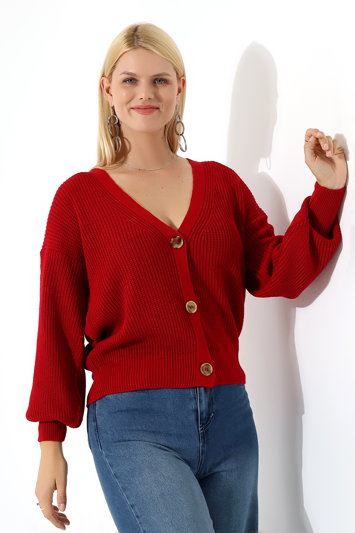 Kadın Kırmızı Uzun Kollu Düğmeli Triko Hırka Kadın Kırmızı Uzun Kollu Düğmeli Triko Hırka MRVN-0014 Standart