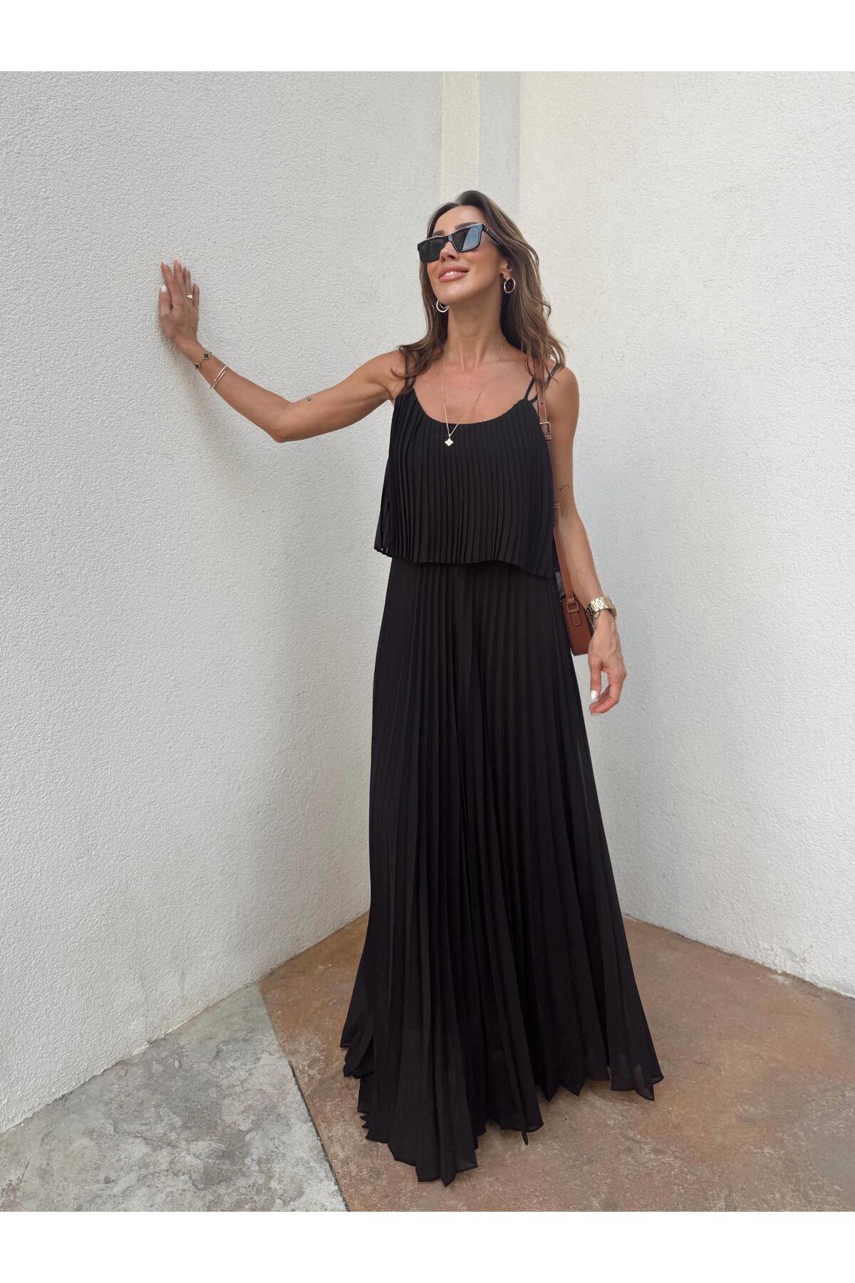 Kadın Pliseli Şifon Siyah Elbise Kadın Pliseli Şifon Siyah Elbise 25YE00778 L