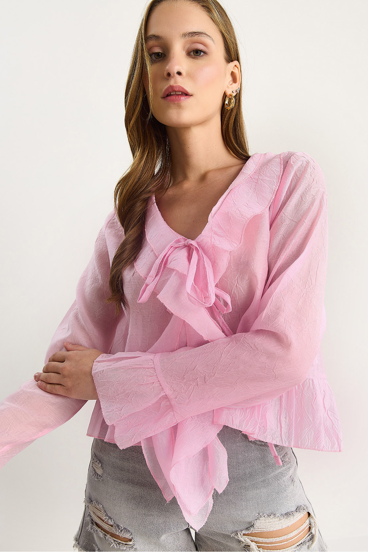 4727 Kadın Yakası Fırfırlı Kraşlı Bluz Pembe 4727 Kadın Yakası Fırfırlı Kraşlı Bluz Pembe Y25BLZ4727 L