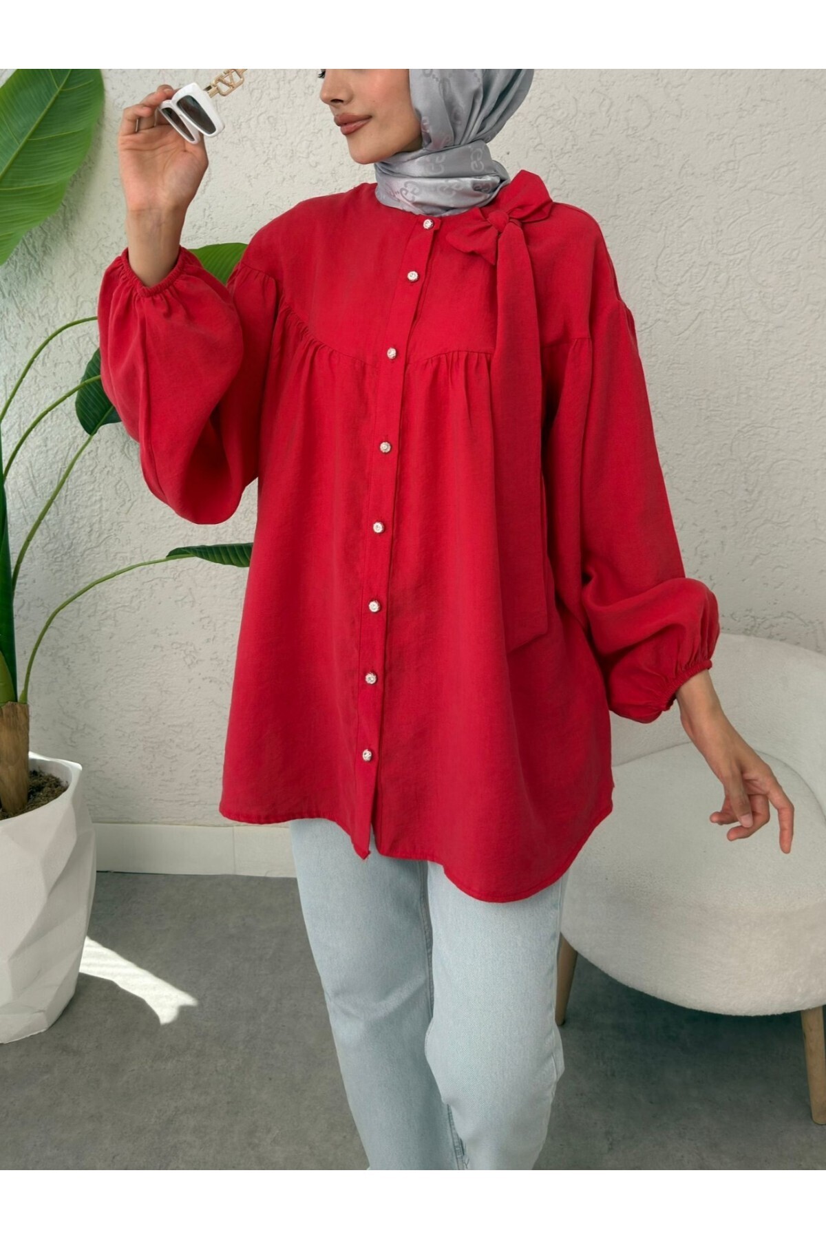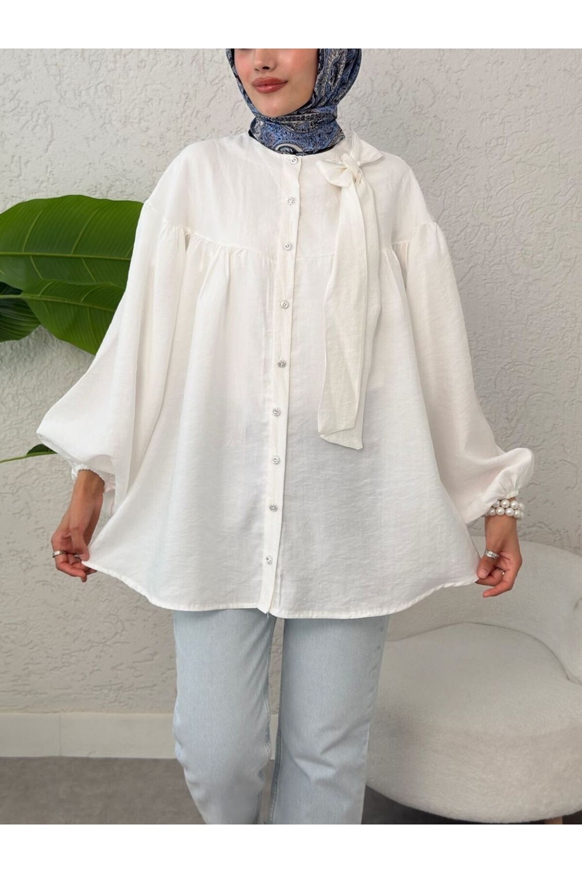 Yakası Fiyonk Detaylı Kolu Lastikli Düğmeli Keten Tunik -Beyaz Yakası Fiyonk Detaylı Kolu Lastikli Düğmeli Keten Tunik -Beyaz TY307-2327 Standart