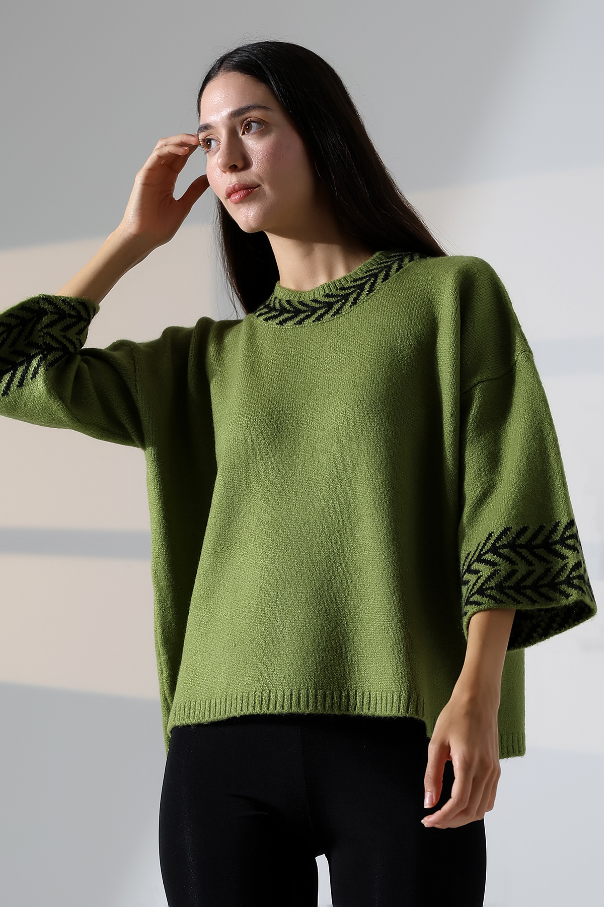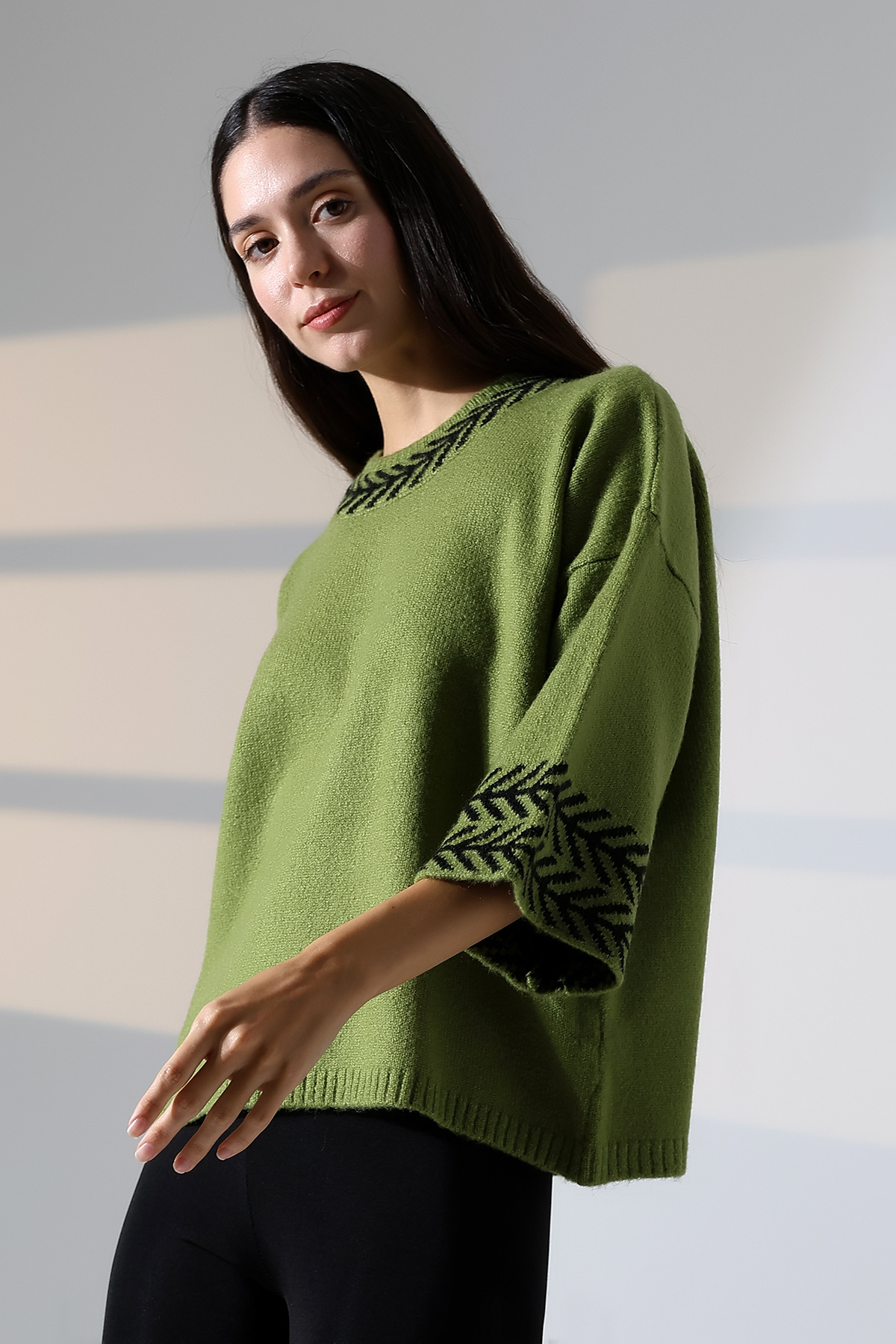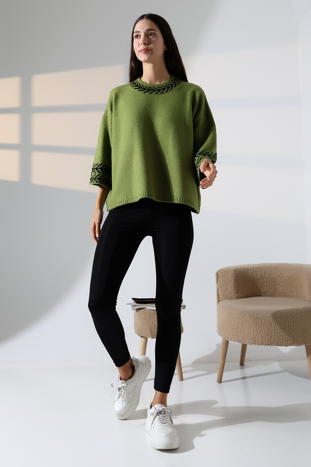 Yuvarlak Bisiklet Yaka Yarım 3/4 Kollu Desenli Jakar Panelli Bol Rahat Basic Şık Zarif Triko Kazak Yuvarlak Bisiklet Yaka Yarım 3/4 Kollu Desenli Jakar Panelli Bol Rahat Basic Şık Zarif Triko Kazak ALCH-00154 Standart
