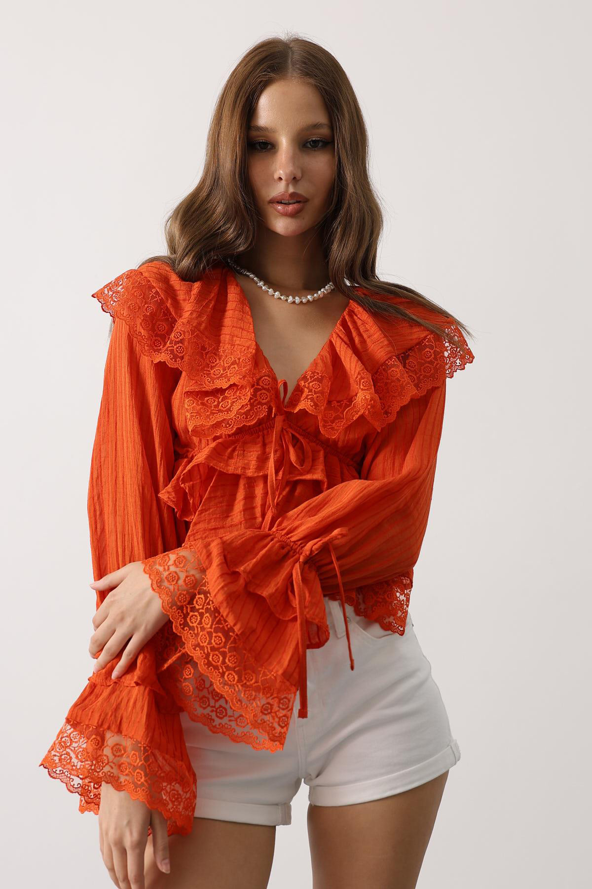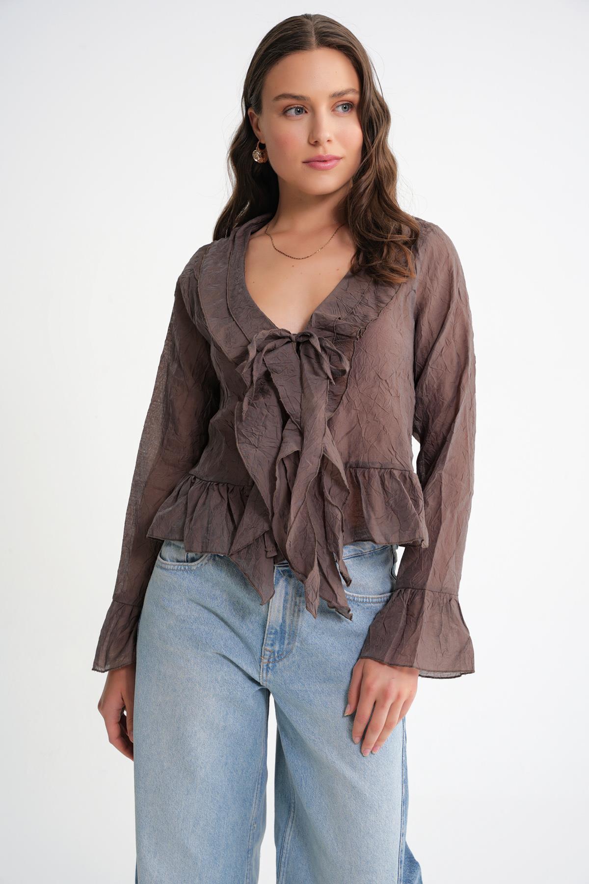 4727 Kadın Yakası Fırfırlı Kraşlı Bluz Kahve 4727 Kadın Yakası Fırfırlı Kraşlı Bluz Kahve Y25BLZ4727 L