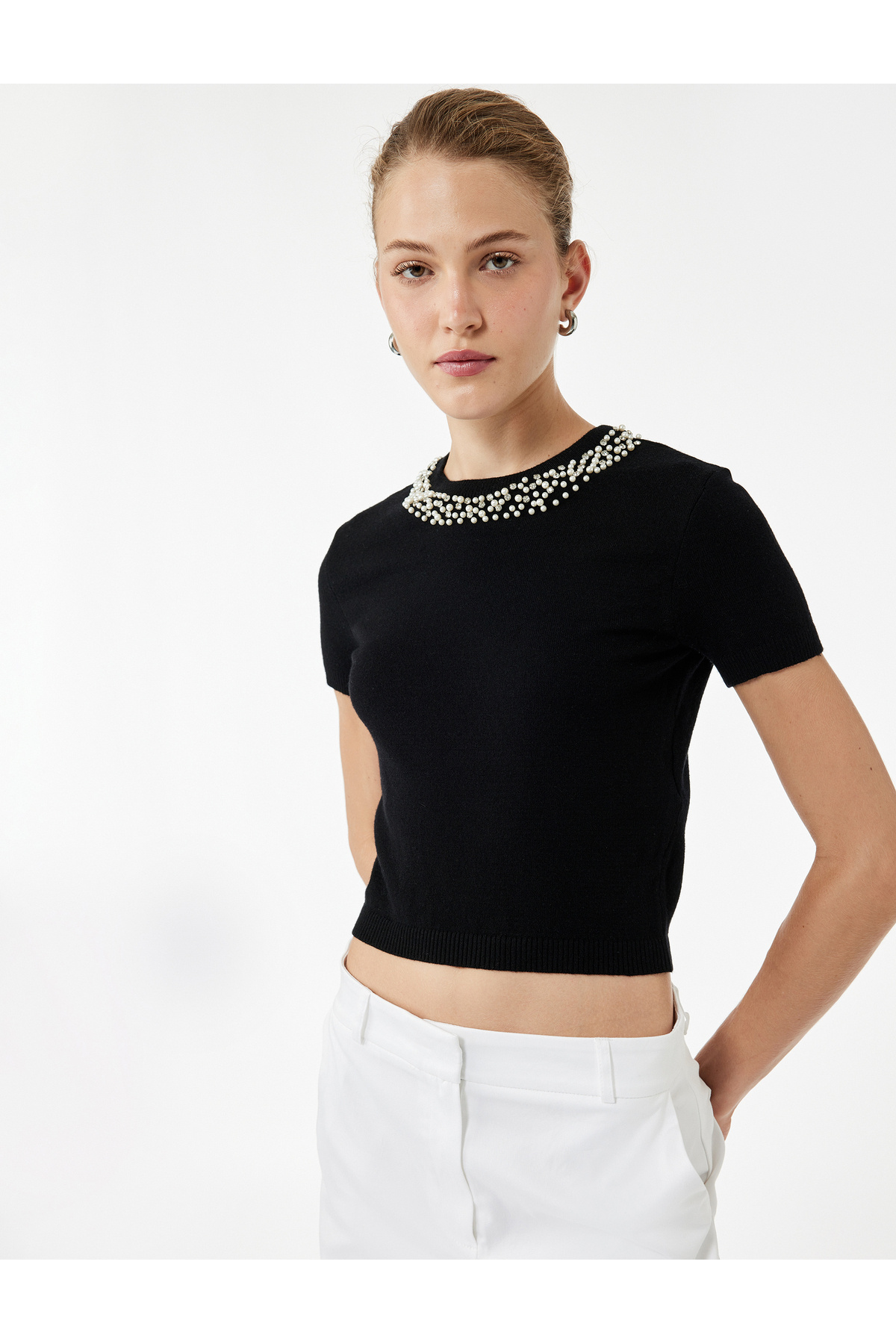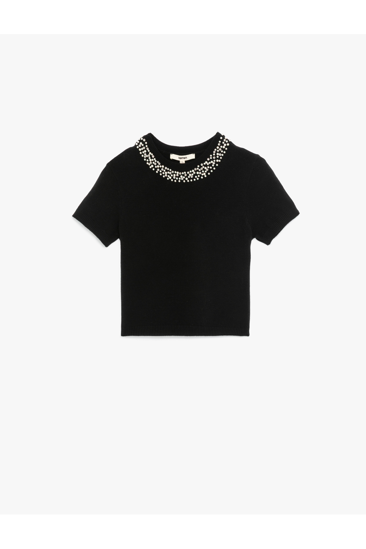 Viskon Karışımlı Boncuk Detaylı Kısa Kollu Triko Kazak Viskon Karışımlı Boncuk Detaylı Kısa Kollu Triko Kazak 6WAK90062HT XL