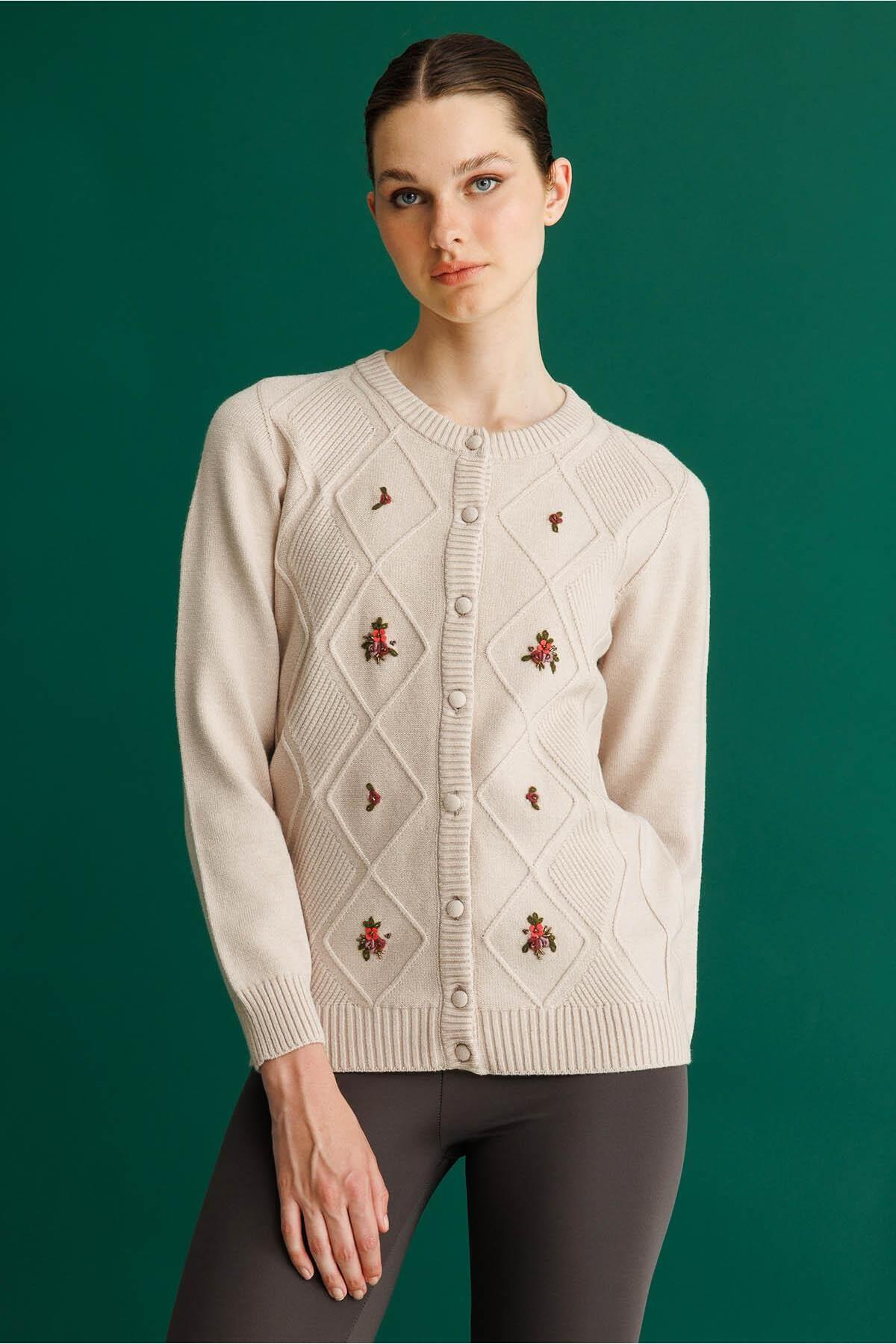 Kadın Sıfır Yaka Önü Baklavalı Nakış İşlemeli Hırka Bej Kadın Sıfır Yaka Önü Baklavalı Nakış İşlemeli Hırka Bej 25211 XL