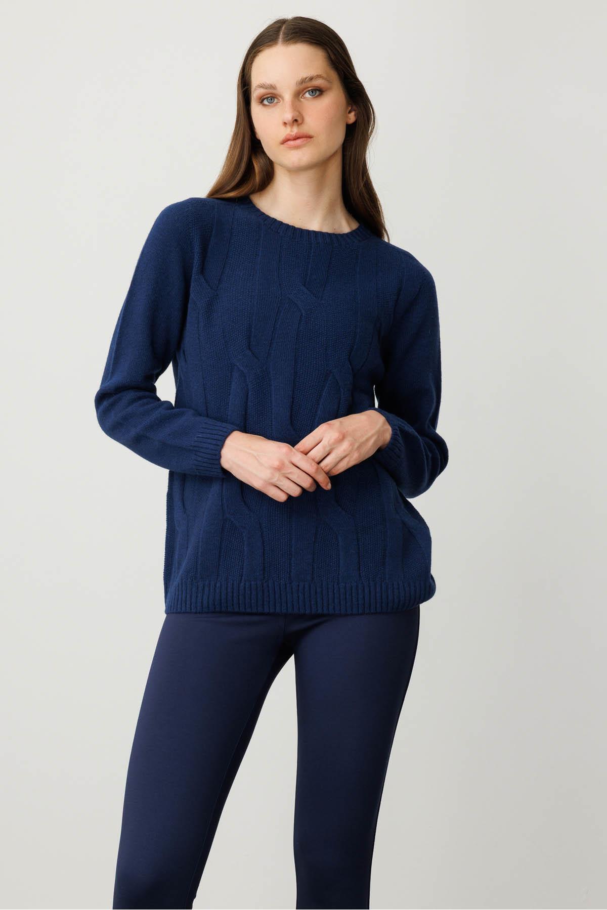 Kadın Sıfır Yaka Kalın Yürütmeli Yün Kazak İndigo Kadın Sıfır Yaka Kalın Yürütmeli Yün Kazak İndigo 25216 XL