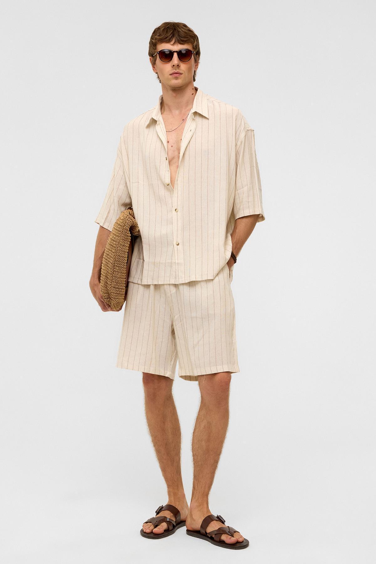 Oversize Çizgili Kısa Kollu Keten Gömlek Vizon Oversize Çizgili Kısa Kollu Keten Gömlek Vizon V40-72 XL