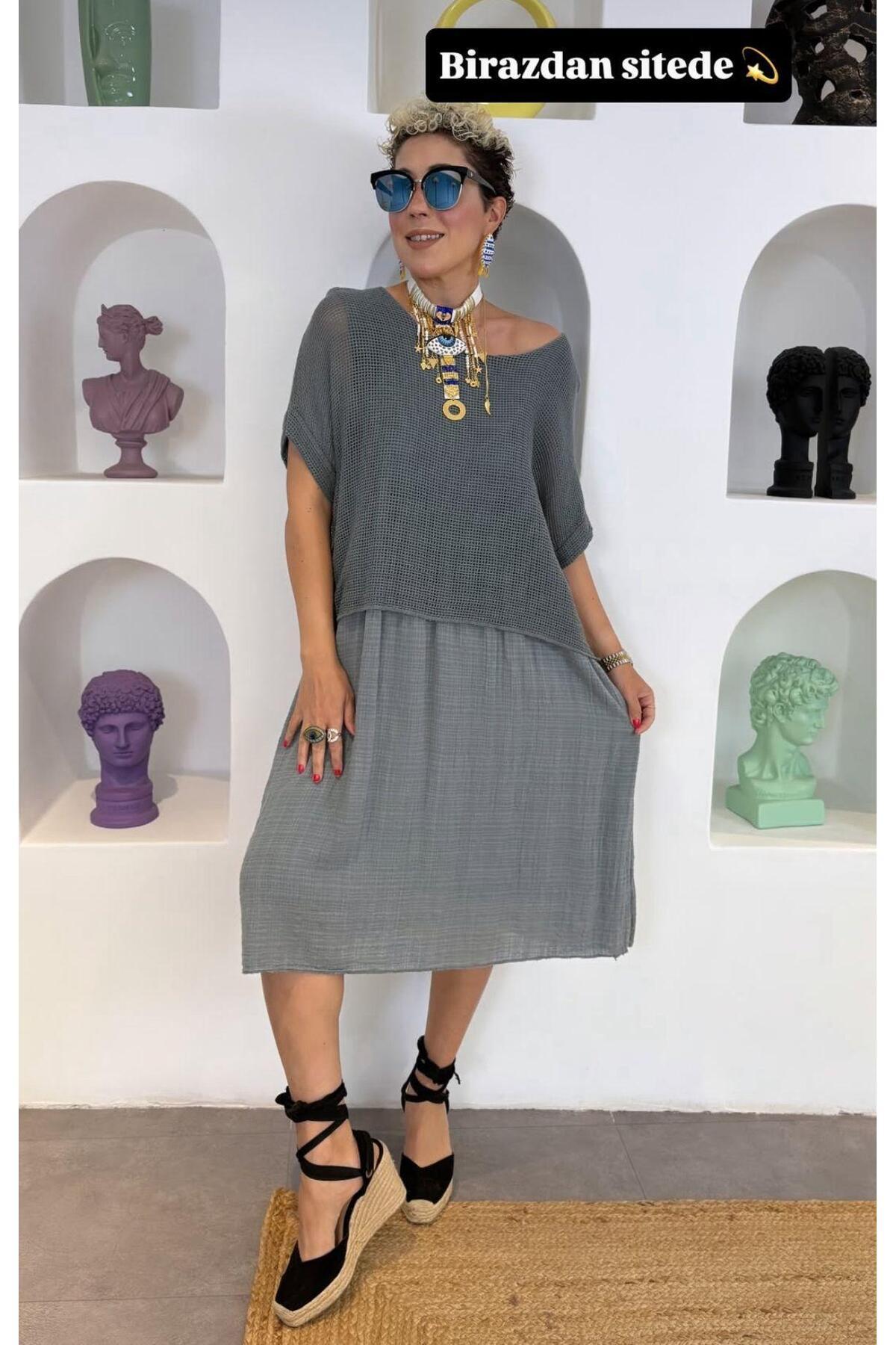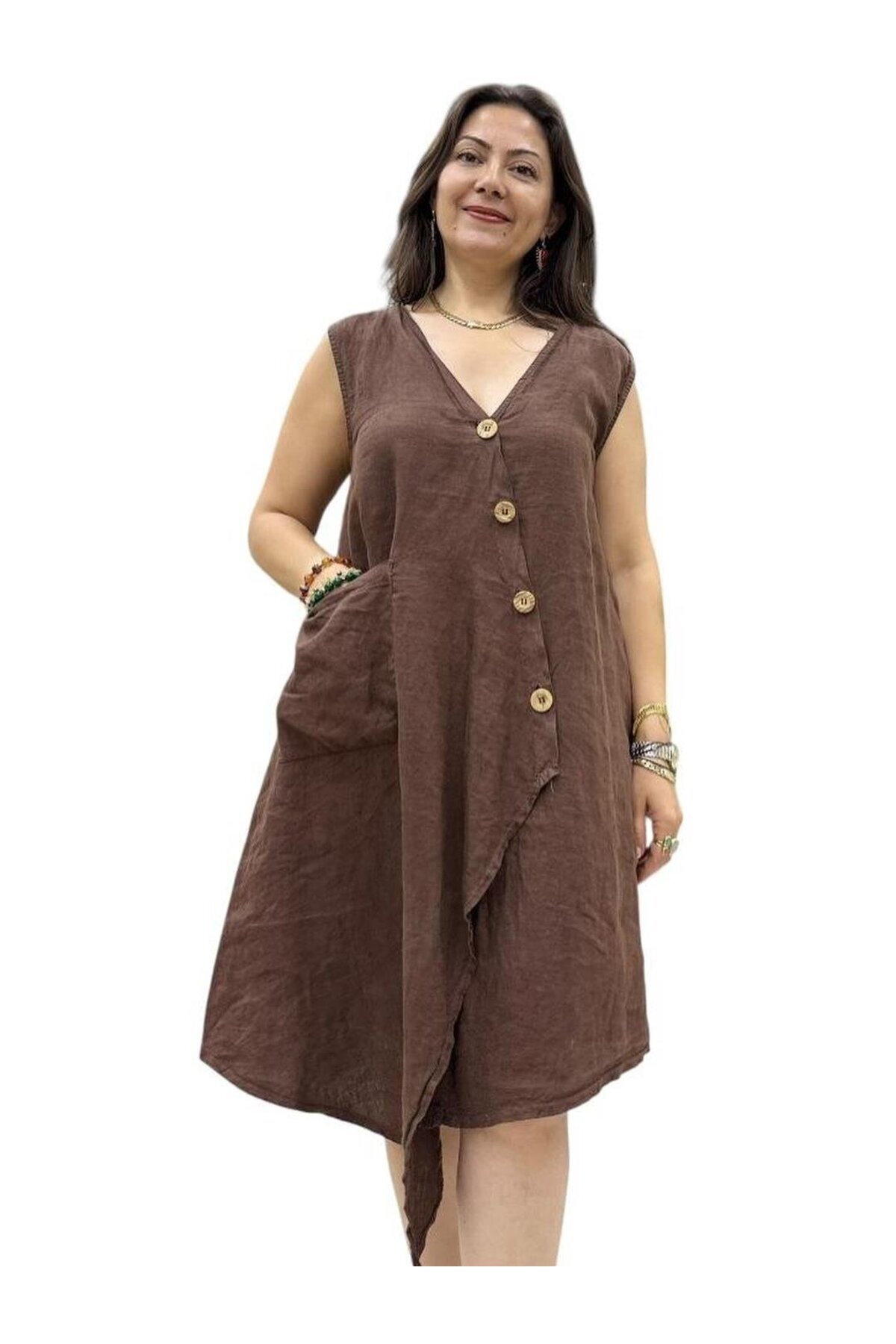 İtalyan Yaka Detaylı Keten Elbise - SİYAH İtalyan Yaka Detaylı Keten Elbise - SİYAH HEB3480 Standart