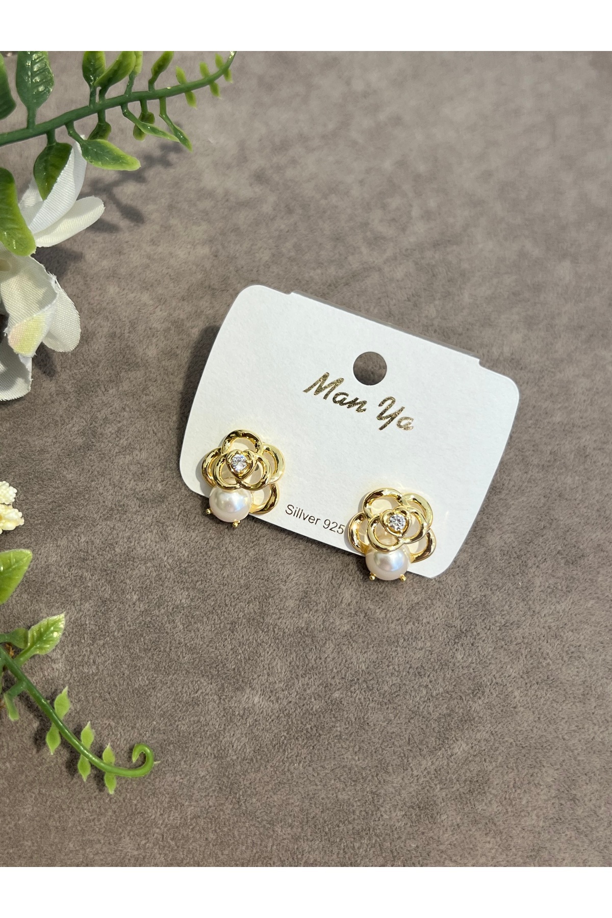 Gold Çiçek Motifli İnci Detaylı Çelik Küpe Gold Çiçek Motifli İnci Detaylı Çelik Küpe incili çiçek küpe تک سایز