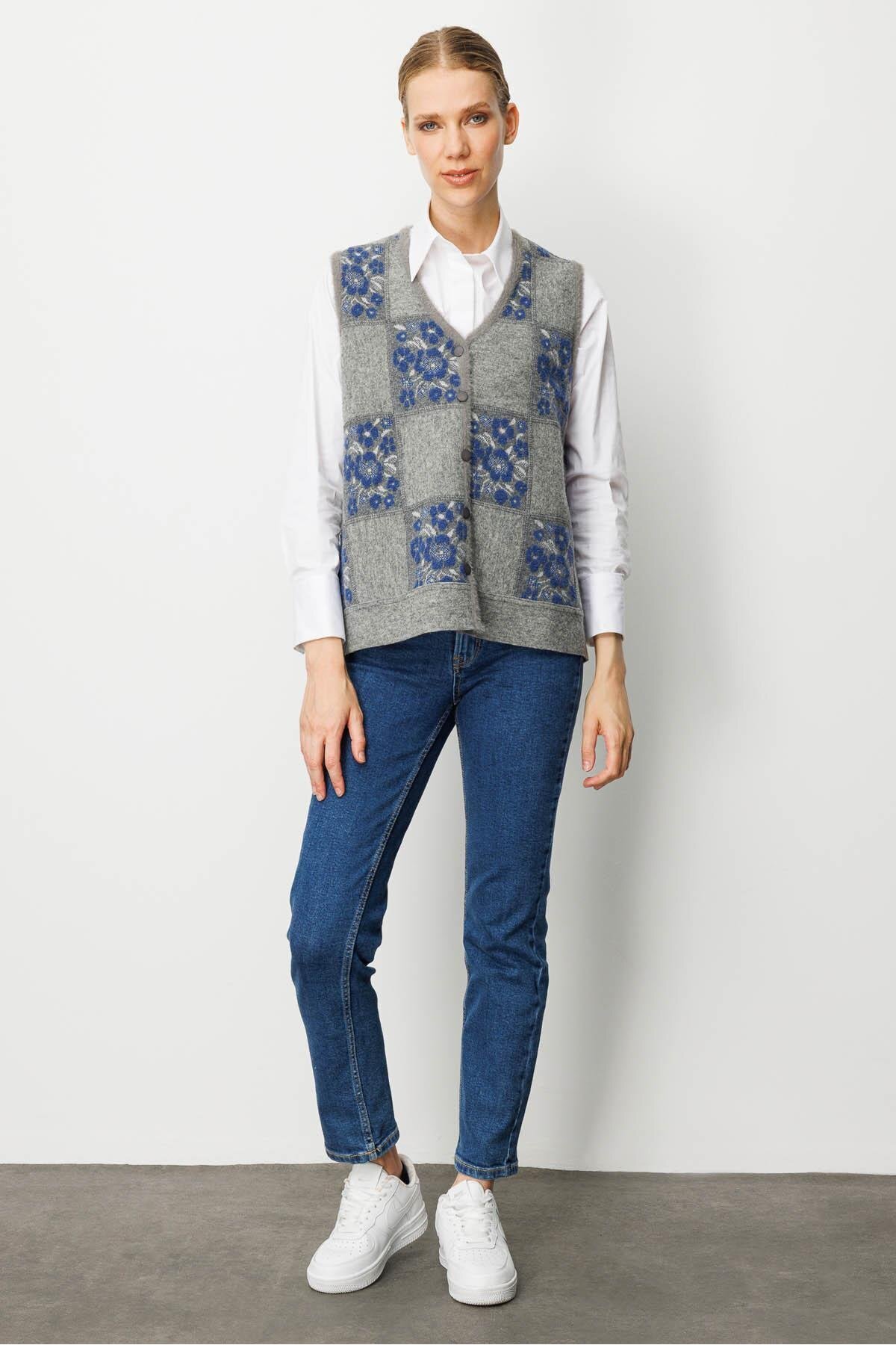 Kadın Pıtırcık Çiçekli Patchwork Keçe Yün Yelek Y.Füme_Mavi Kadın Pıtırcık Çiçekli Patchwork Keçe Yün Yelek Y.Füme_Mavi 24084 XL
