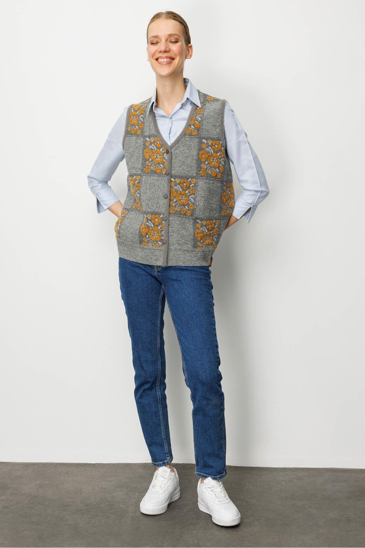 Kadın Pıtırcık Çiçekli Patchwork Keçe Yün Yelek Y.Füme_Hardal Kadın Pıtırcık Çiçekli Patchwork Keçe Yün Yelek Y.Füme_Hardal 24084 XL