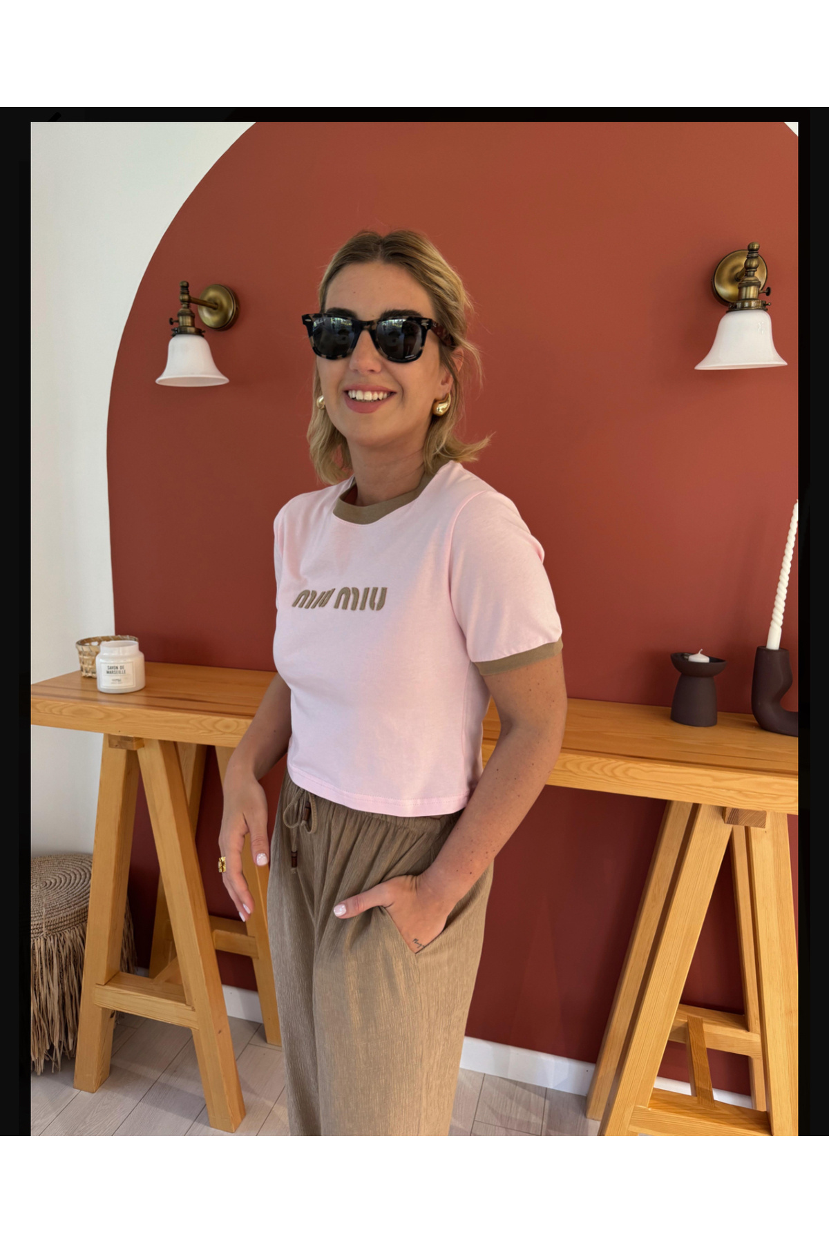 kadın pembe kahverengi detaylı pamuklu crop t-shiirt kadın pembe kahverengi detaylı pamuklu crop t-shiirt pembe tişört L