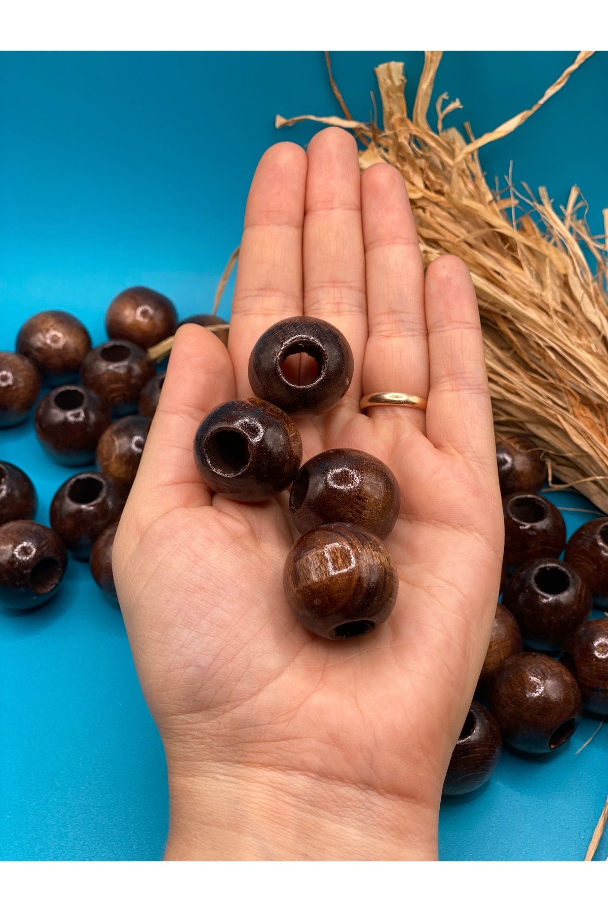 24 mm Kahverengi Ahşap Boncuk (13 Adet) Yuvarlak Makrome Çanta Tasarım Tahta Boncuk Delik Çapı 9 mm