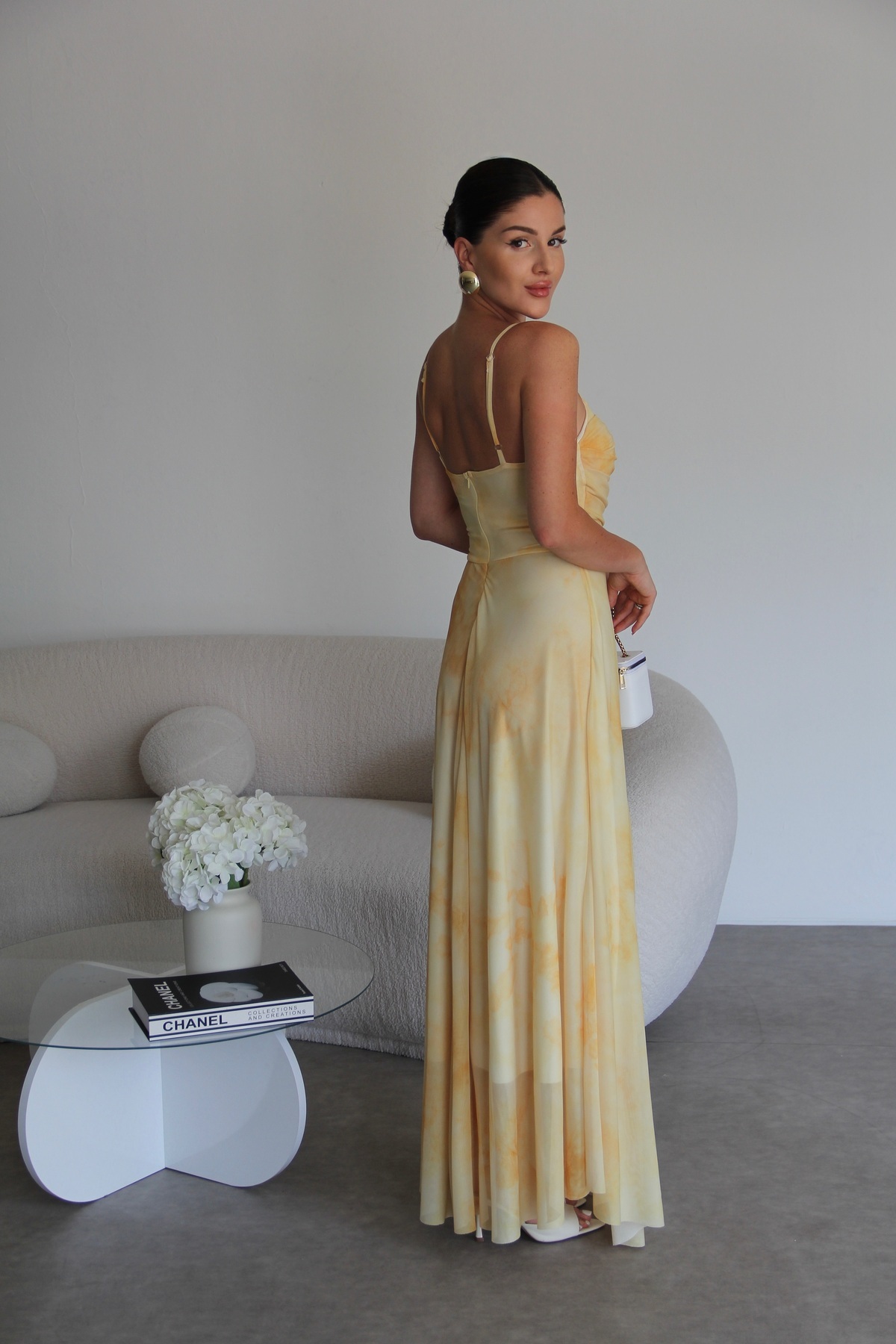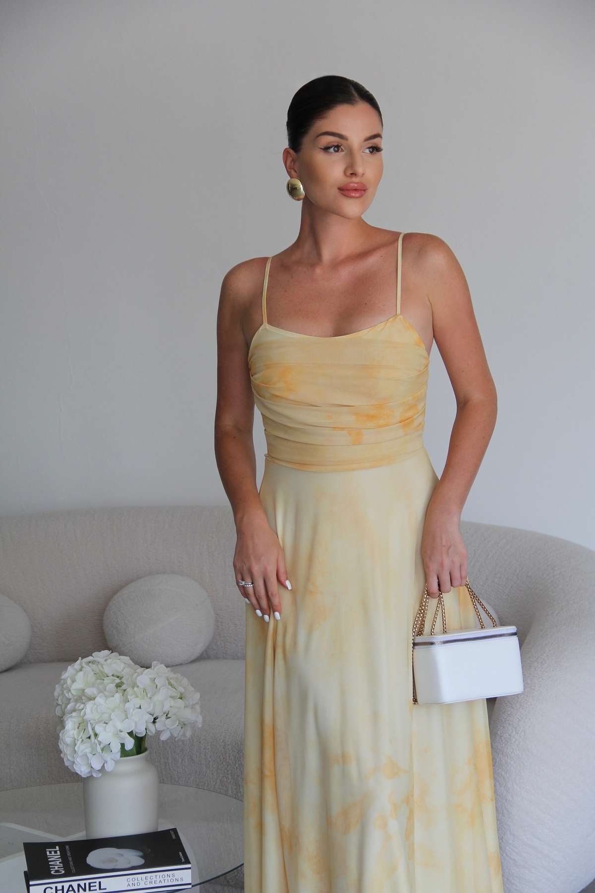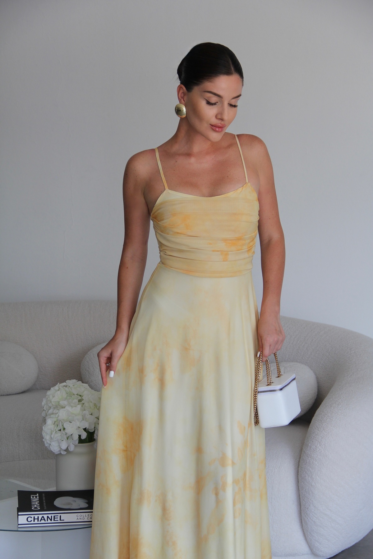 Sarı Askılı Straplez Desenli Astarlı Premium Şifon Tül Elbise Sarı Askılı Straplez Desenli Astarlı Premium Şifon Tül Elbise JulidressTEK560 L