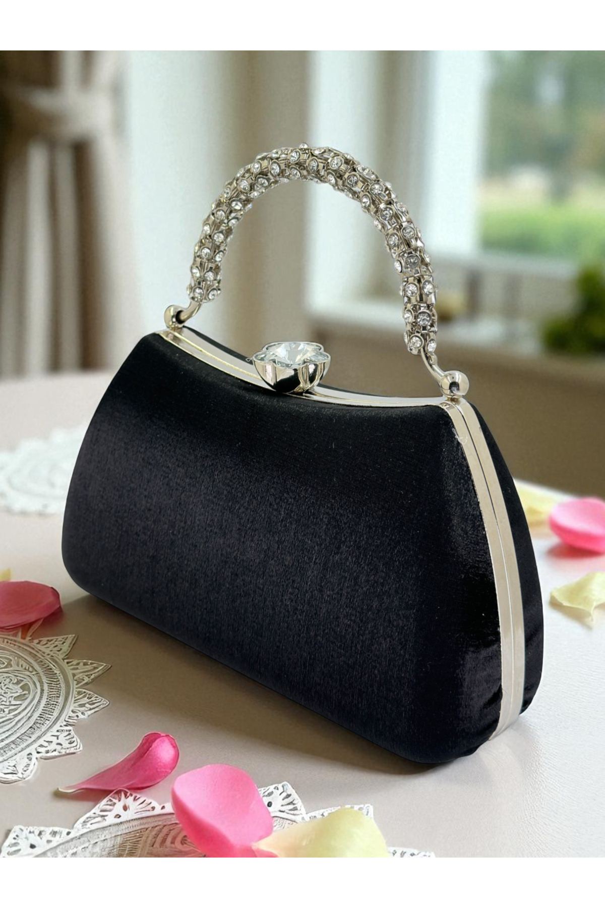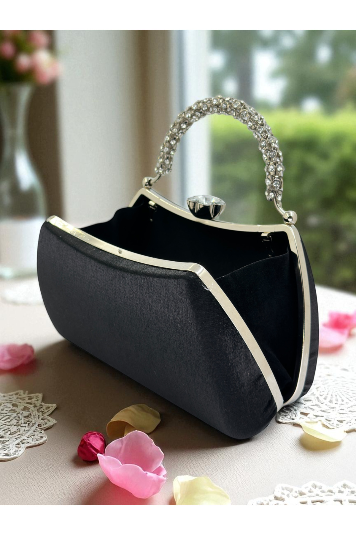 Özel Tasarım Siyah Renk Simli Saten Saplı Kulplu Kadın Abiye Çanta Düğün Nişan Balo Özel Tasarım Siyah Renk Simli Saten Saplı Kulplu Kadın Abiye Çanta Düğün Nişan Balo 220-S Saten Taşlı تک سایز