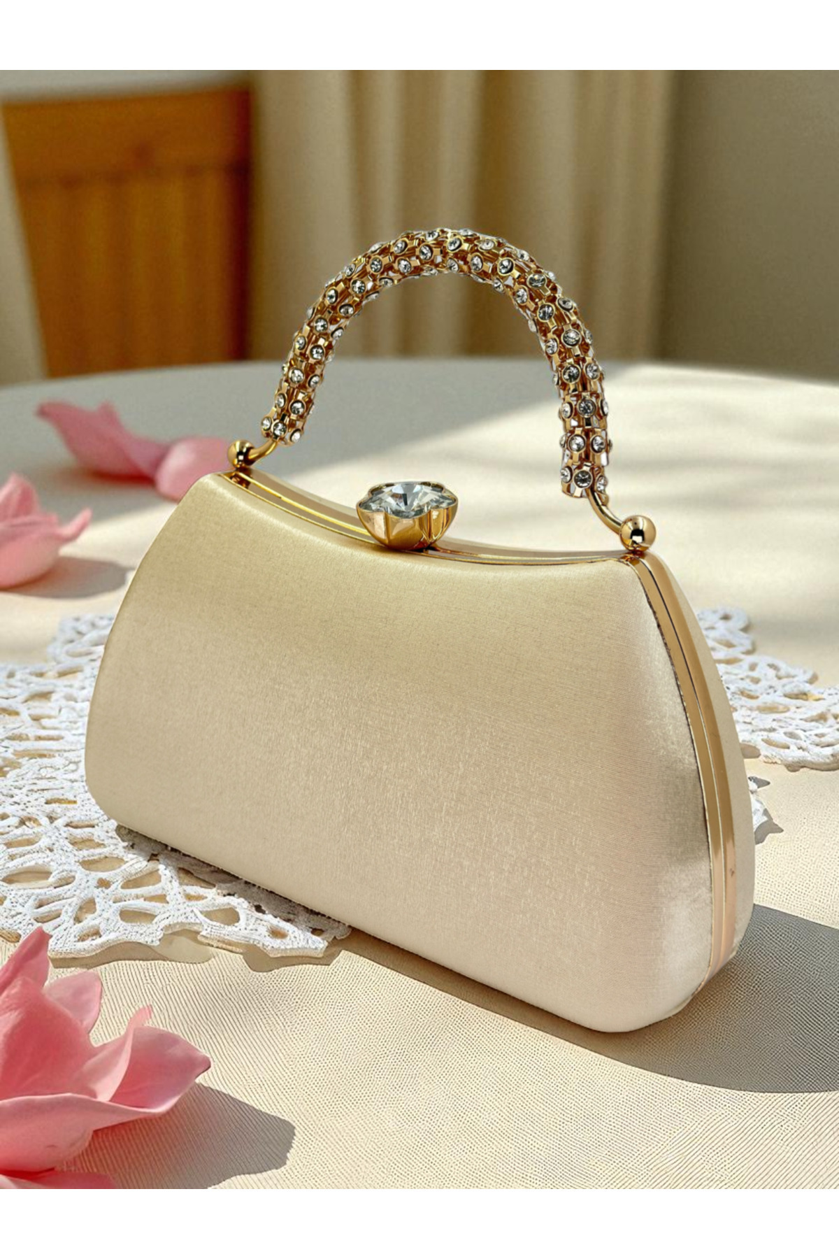 Özel Tasarım Ten Renk Altın Detaylı Simli Saten Saplı Kulplu Kadın Abiye Çanta Düğün Nişan Balo Özel Tasarım Ten Renk Altın Detaylı Simli Saten Saplı Kulplu Kadın Abiye Çanta Düğün Nişan Balo 220-S Saten Taşlı تک سایز
