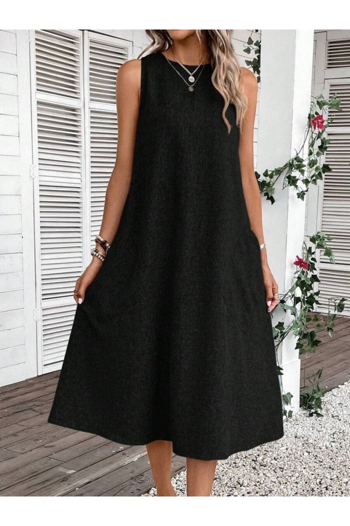 Bisiklet Yaka Cepli Midi Keten Elbise Bisiklet Yaka Cepli Midi Keten Elbise 87162 2XL-3XL