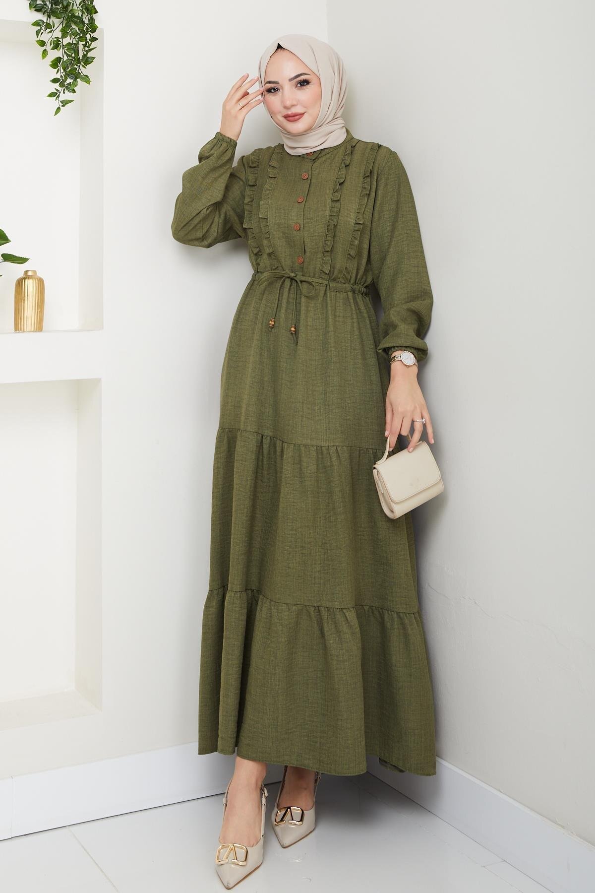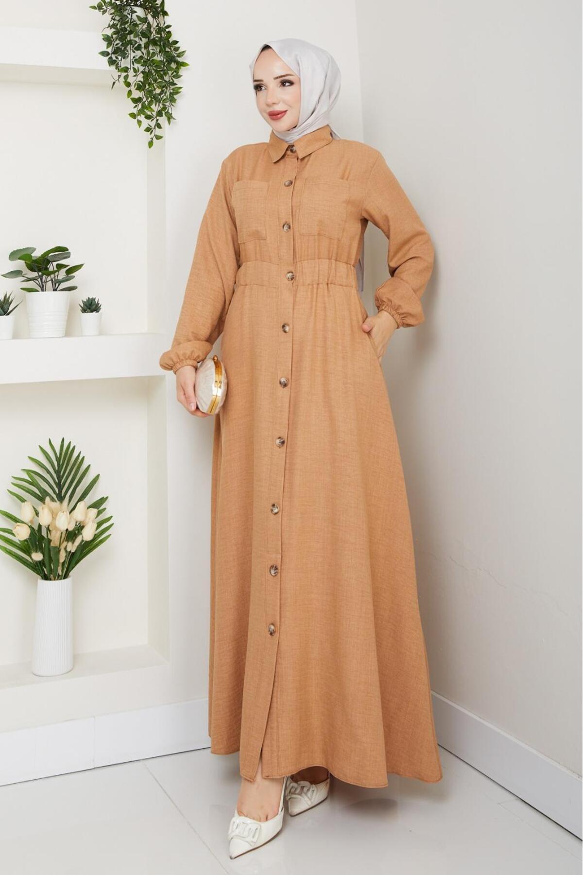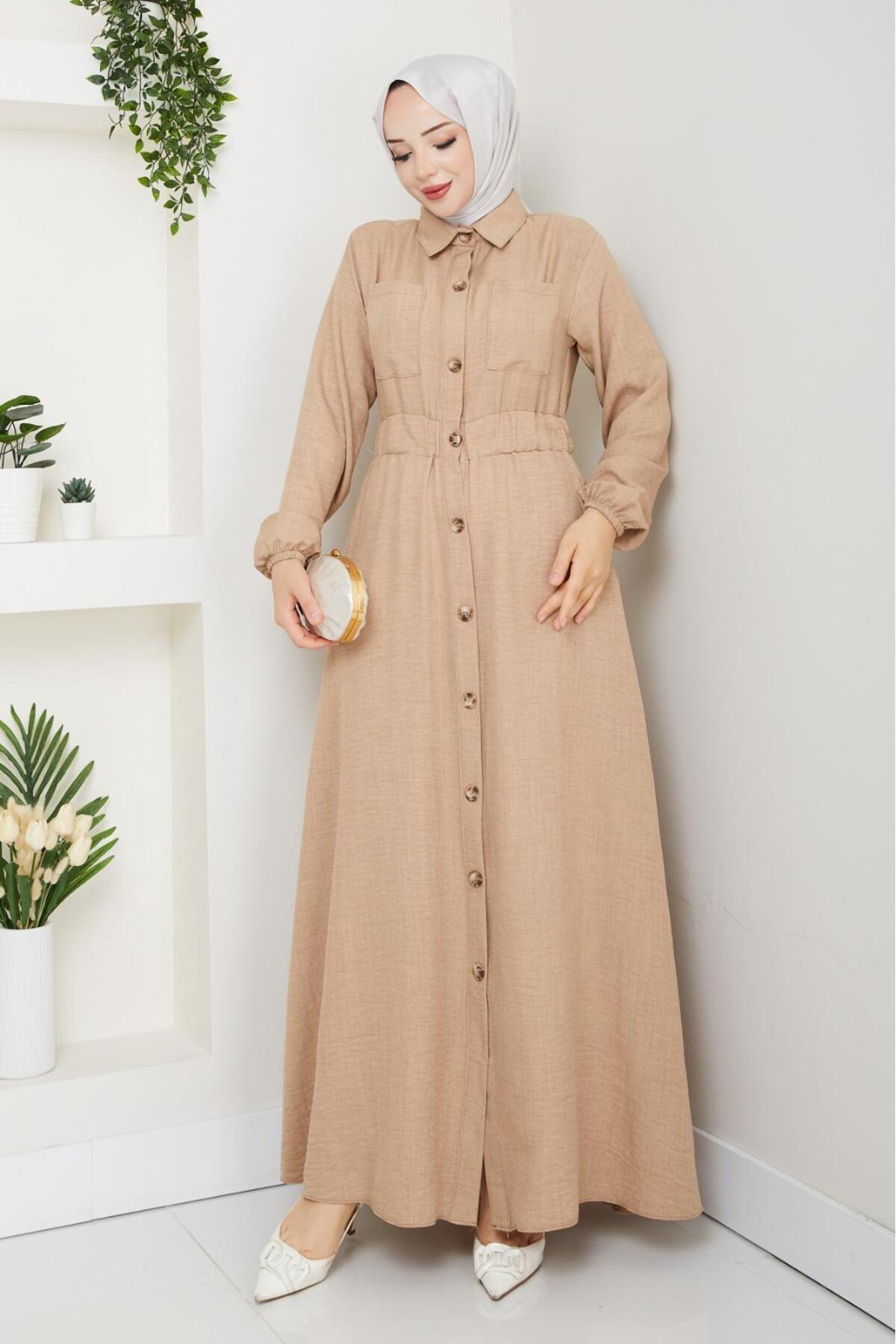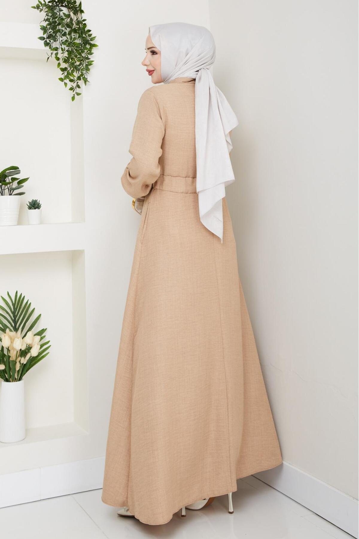 Kadın Cep Detaylı Düğmeli Kuşaklı Vizon Keten Elbise Kadın Cep Detaylı Düğmeli Kuşaklı Vizon Keten Elbise 0003 48