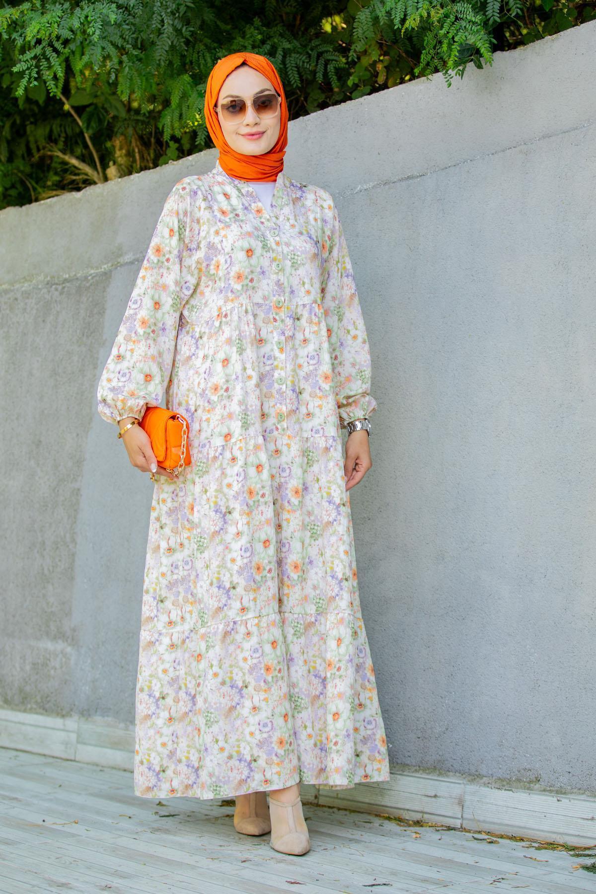 Kadın Desenli Tesettür Elbise 2583 - Bej Kadın Desenli Tesettür Elbise 2583 - Bej 2583BGD19 46