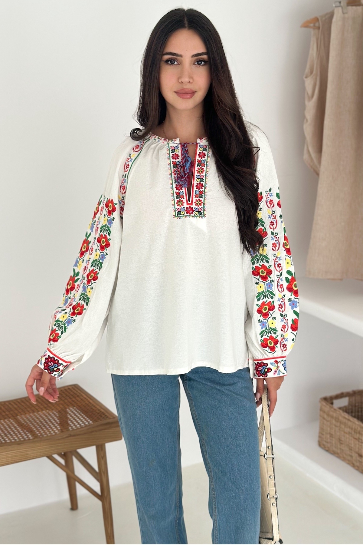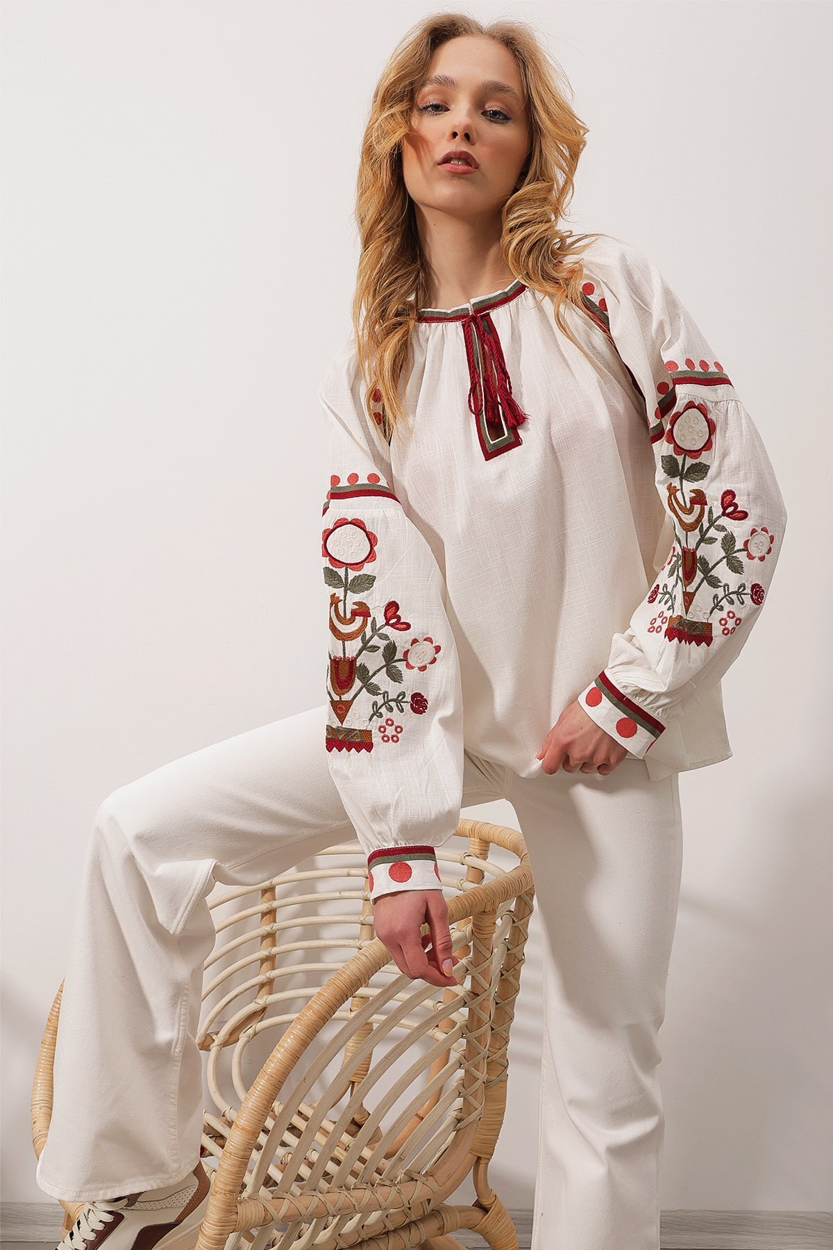 Kadın Beyaz Vintage Çiçek Nakış İşlemeli Püsküllü Pamuklu Bluz Kadın Beyaz Vintage Çiçek Nakış İşlemeli Püsküllü Pamuklu Bluz 5697 L
