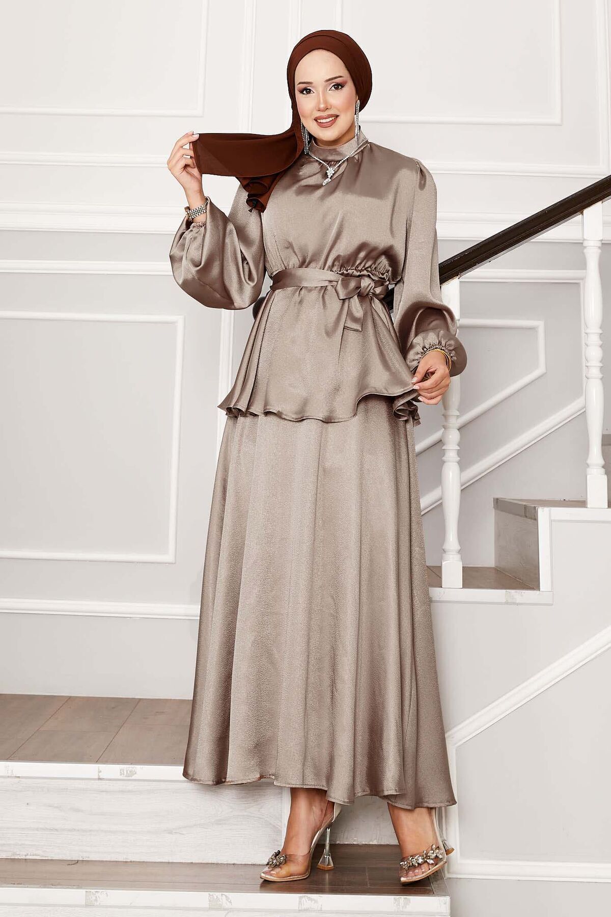 Beli Büzgülü Kuşak Detaylı Saten Etekli Takım Beli Büzgülü Kuşak Detaylı Saten Etekli Takım 553528-125M00621070 46-48