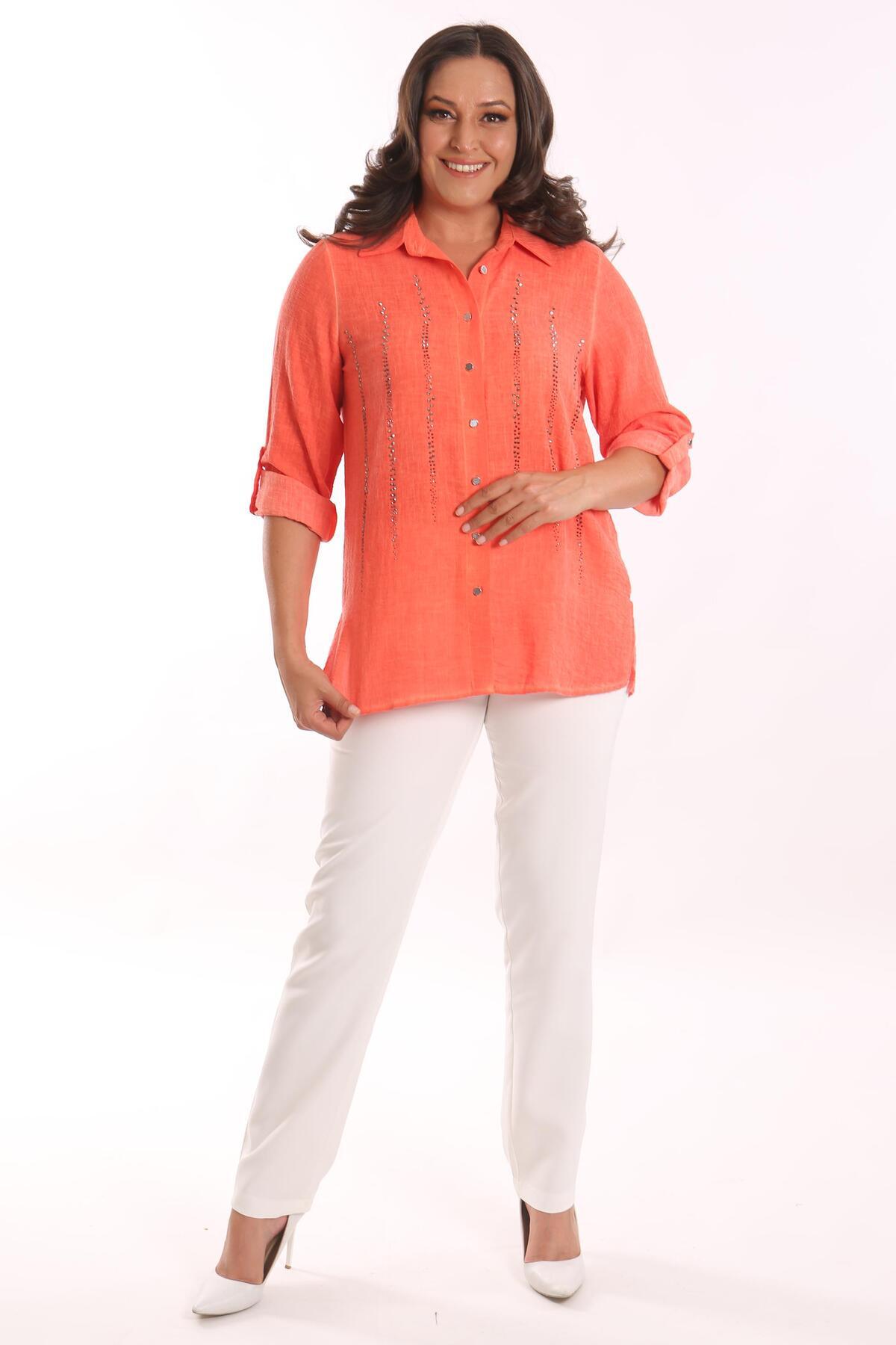 Trend42plus Büyük Beden Oranj Taş Baskılı Batik Yıkamalı Gömlek Trend42plus Büyük Beden Oranj Taş Baskılı Batik Yıkamalı Gömlek 10592 48