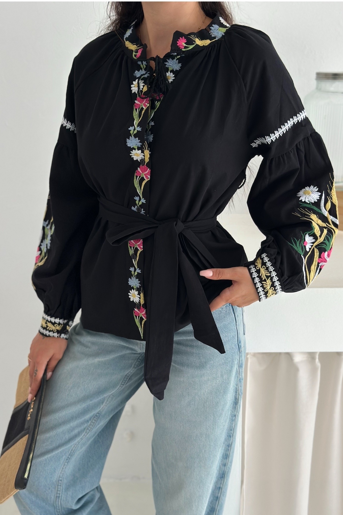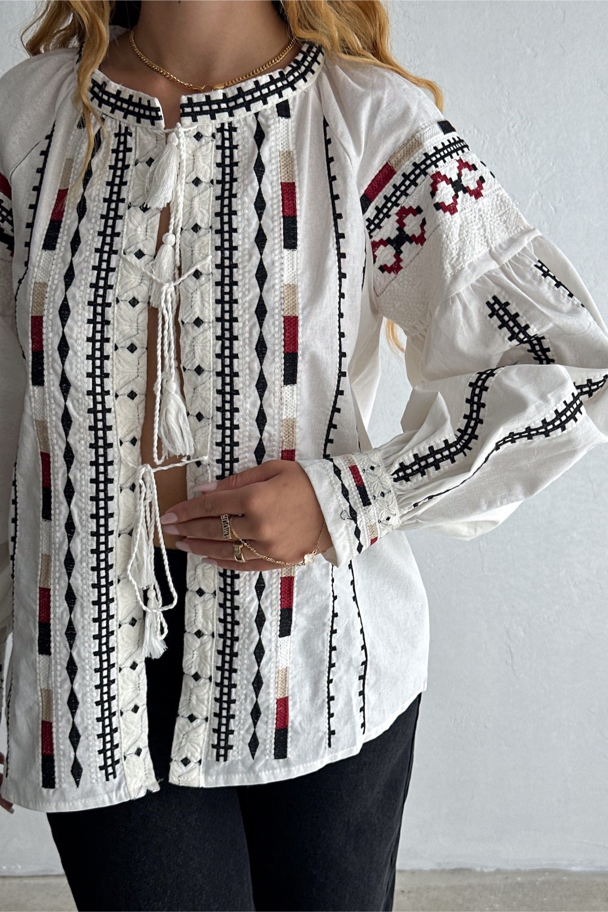 Kadın Püsküllü Renkli Etnik Desenli Nakış İşlemeli Pamuklu Bluz Kadın Püsküllü Renkli Etnik Desenli Nakış İşlemeli Pamuklu Bluz 5705 L