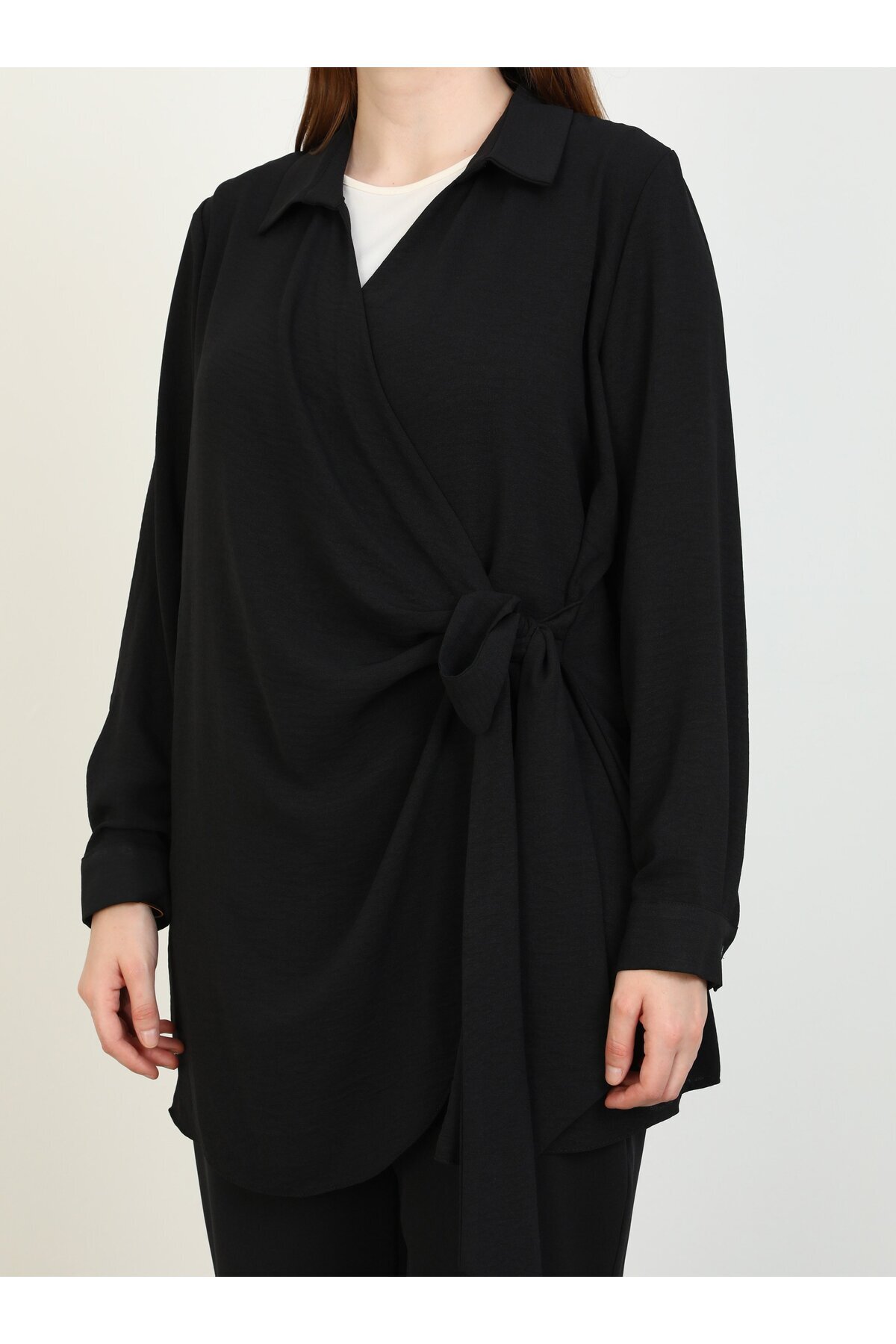 Gömlek Yaka Bağlama Detaylı Kruvaze Kapama Büyük Beden Tunik - Siyah - Gömlek Yaka Bağlama Detaylı Kruvaze Kapama Büyük Beden Tunik - Siyah - 9109647 52
