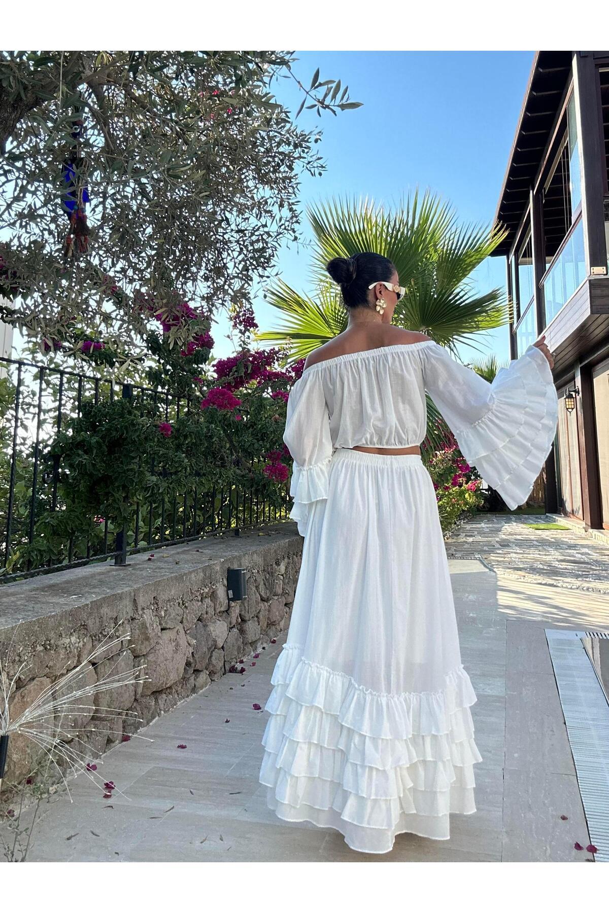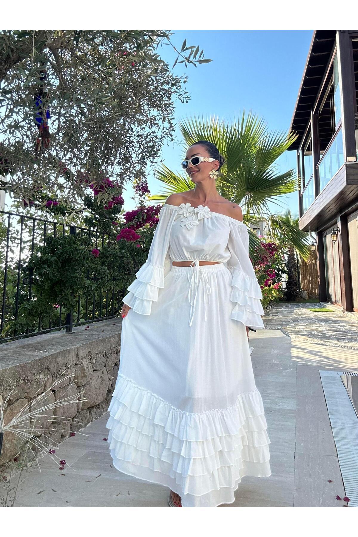 Beyaz Çıkabilen Çiçek Broşlu Etek Bluz Takım Beyaz Çıkabilen Çiçek Broşlu Etek Bluz Takım AD2566 42