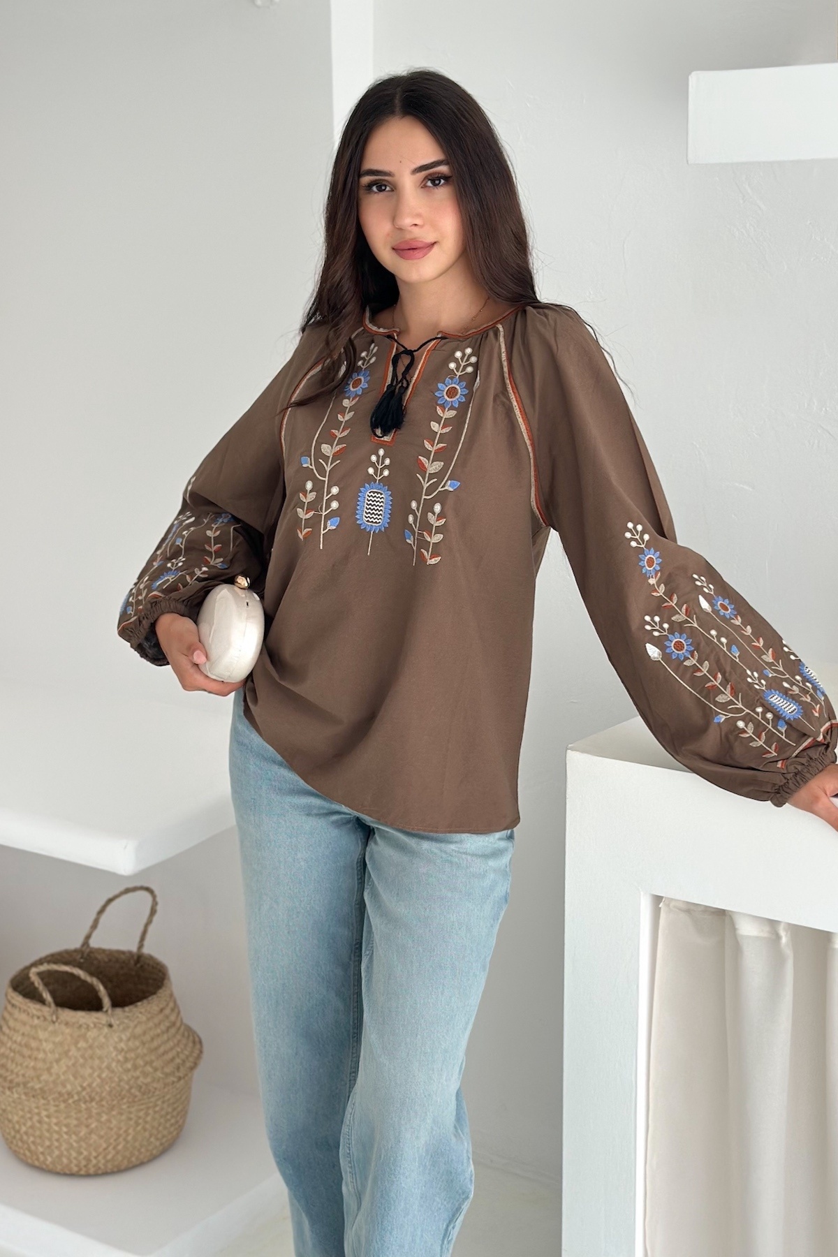 Kadın Kahverengi Bohem Etnik Desen Nakış İşlemeli Pamuklu Bluz Kadın Kahverengi Bohem Etnik Desen Nakış İşlemeli Pamuklu Bluz 5321 L