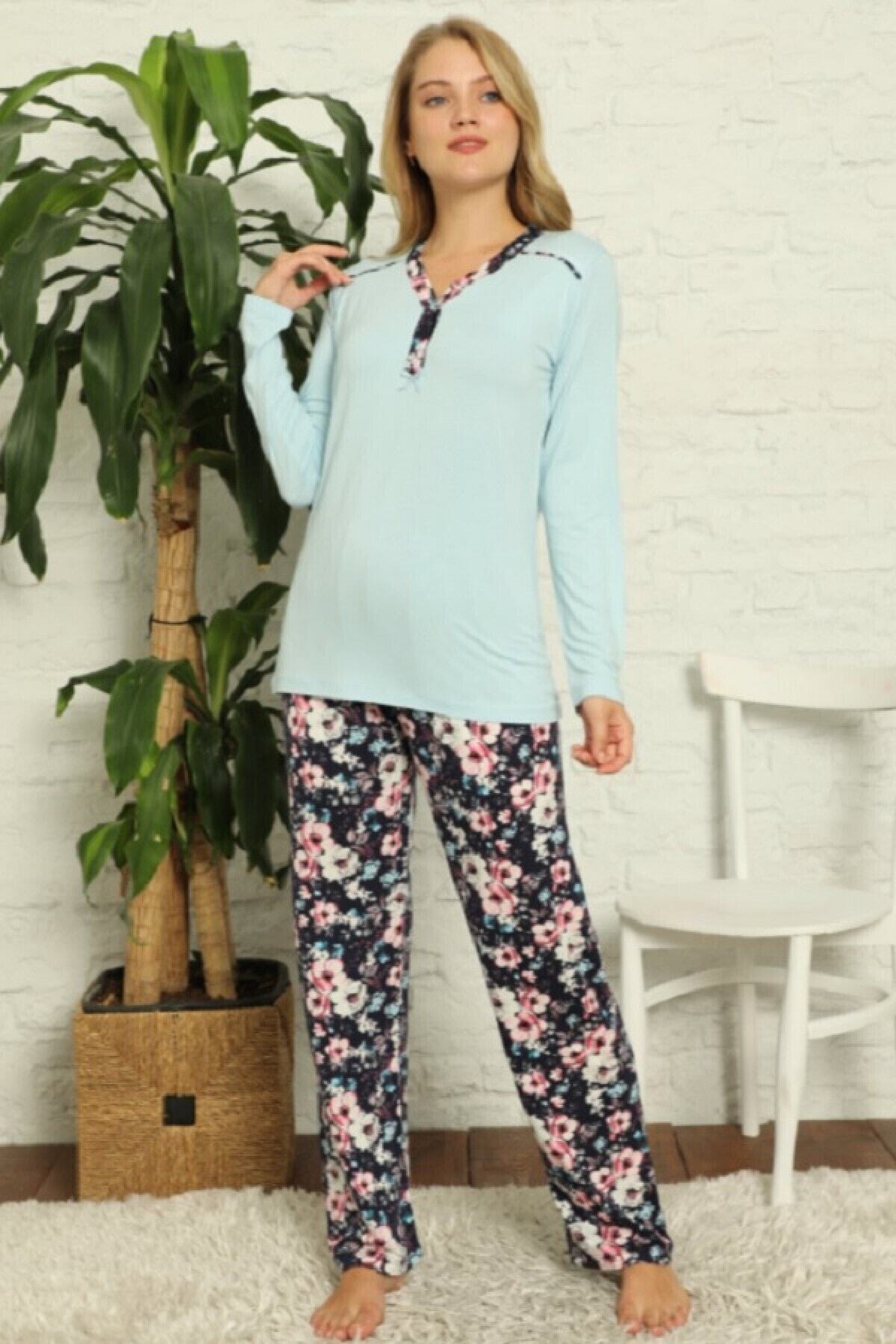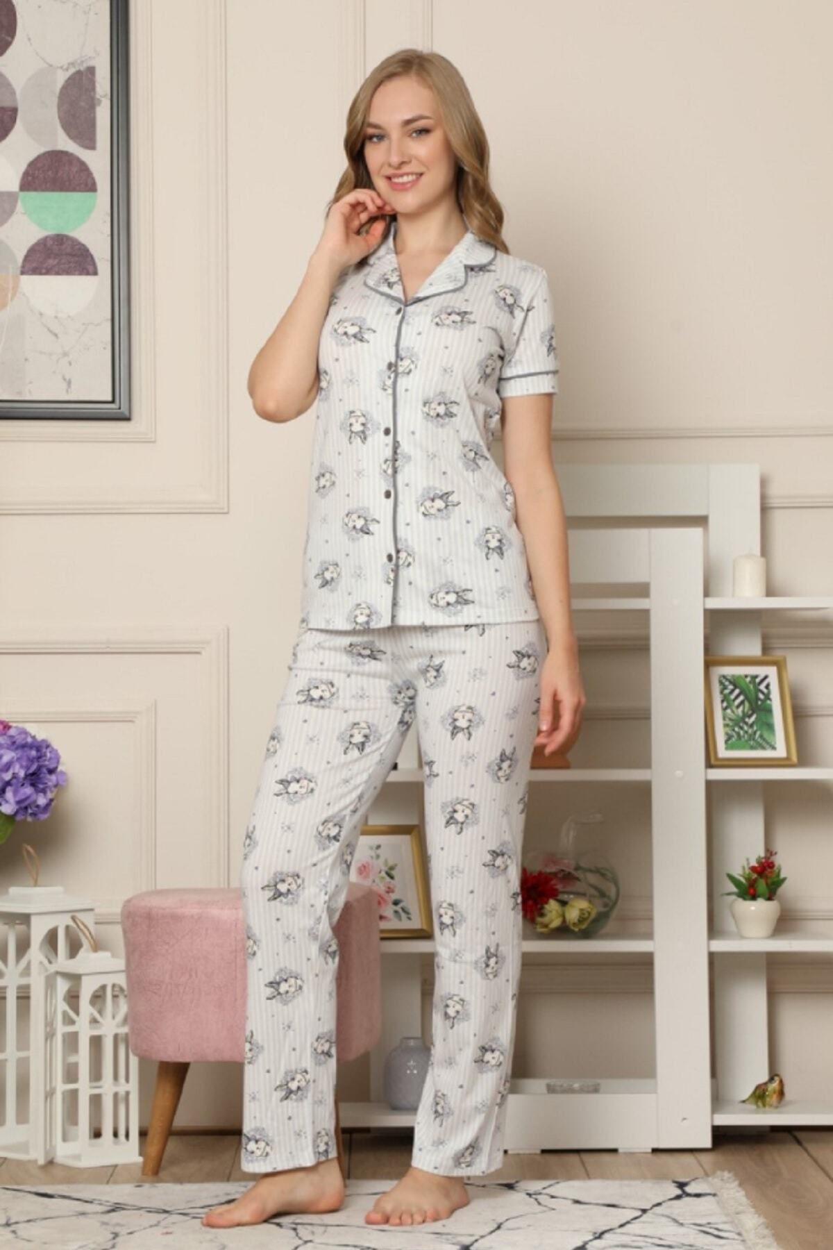 Kadın Saks Mavi 3 Düğmeli Etnik Desen Likralı Viskon Kısa Kol Pijama Takımı Kadın Saks Mavi 3 Düğmeli Etnik Desen Likralı Viskon Kısa Kol Pijama Takımı T3515 2XL