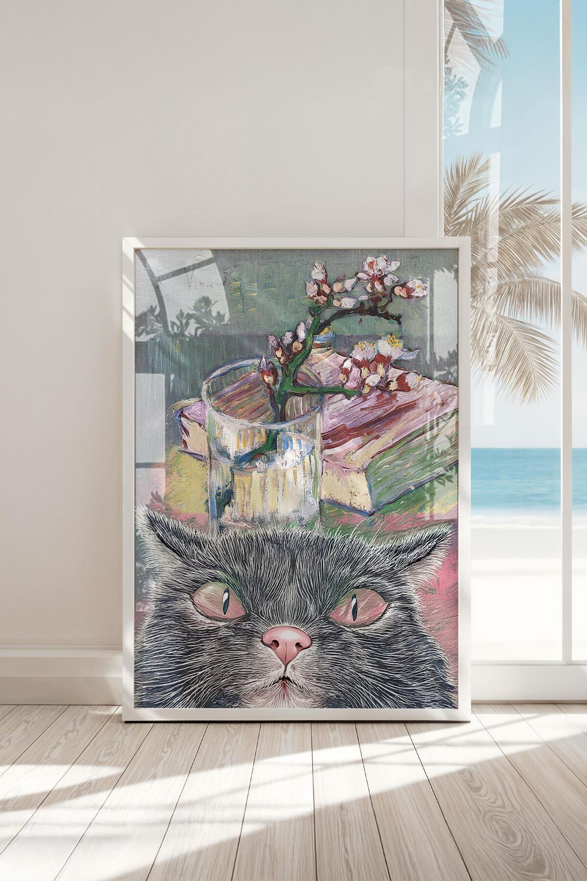 Van Gogh Badem Çiçekleri Kedili Sanat Tablosu - Beyaz Çerçeveli Van Gogh Badem Çiçekleri Kedili Sanat Tablosu - Beyaz Çerçeveli TABLOTEKLI98SIDU76SD 50 x 70