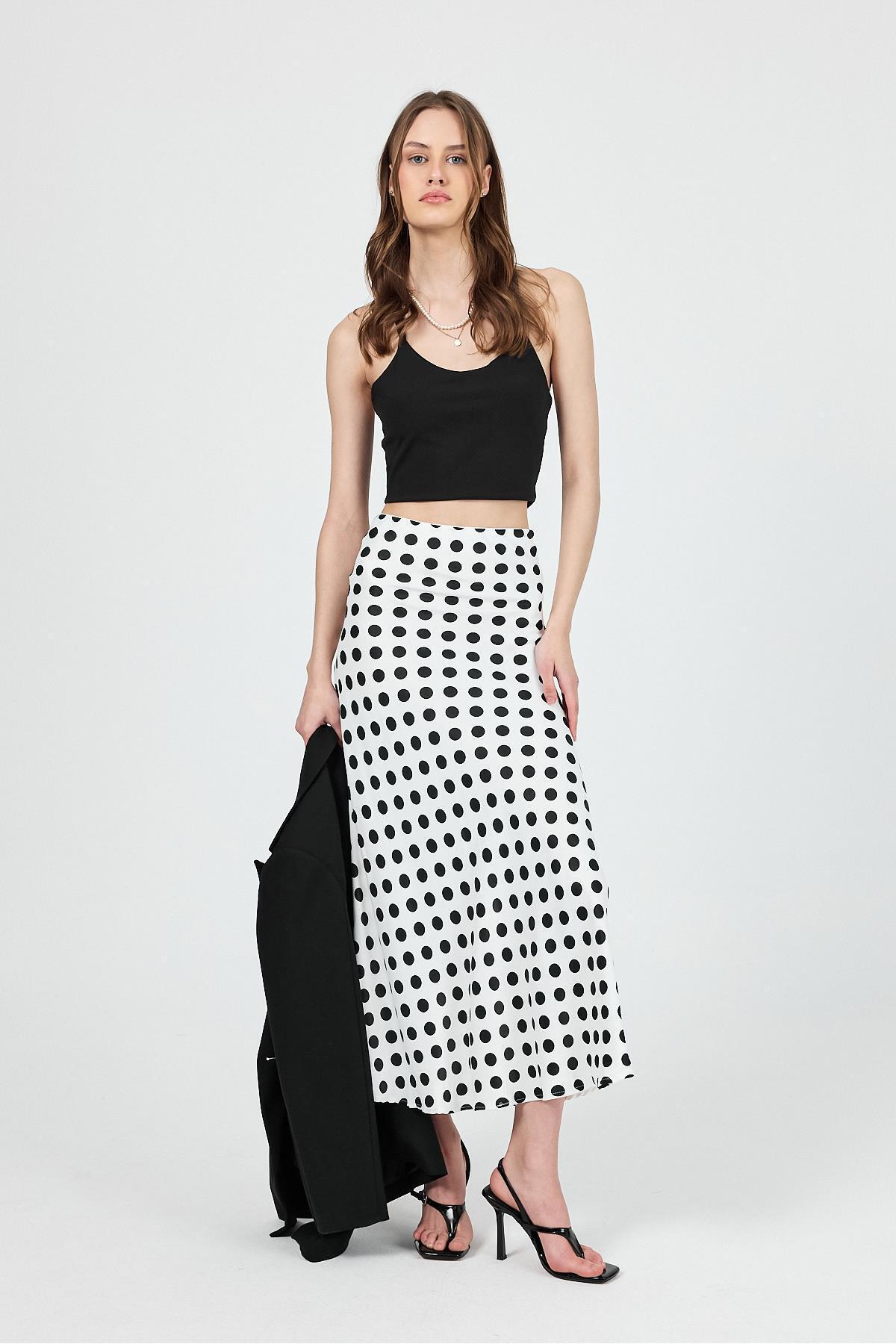 Lacivert Puantiyeli 82cm Midi Boy Şık Saten Etek Lacivert Puantiyeli 82cm Midi Boy Şık Saten Etek K0060 L