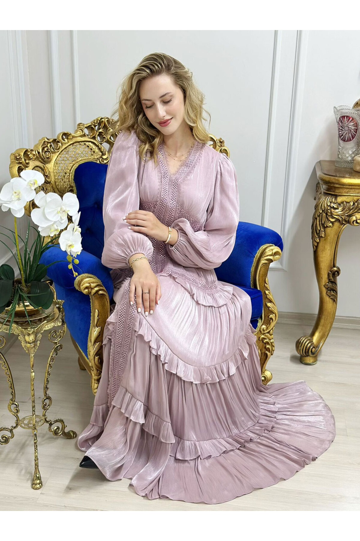 Gül Kurusu Rengi Güpür Detaylı Balon Kollu Şifon Özel Elbise Gül Kurusu Rengi Güpür Detaylı Balon Kollu Şifon Özel Elbise GK-GB-ELB