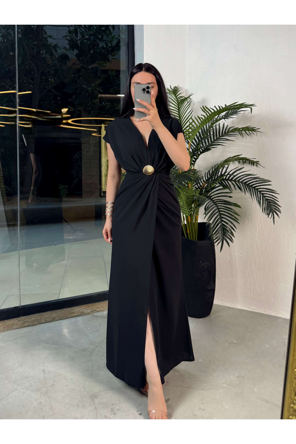Nomia Deniz Kabuğu Aksesuarlı Çapraz Kesim Dekolteli Uzun Elbise Siyah Nomia Deniz Kabuğu Aksesuarlı Çapraz Kesim Dekolteli Uzun Elbise Siyah MSK1044 XL