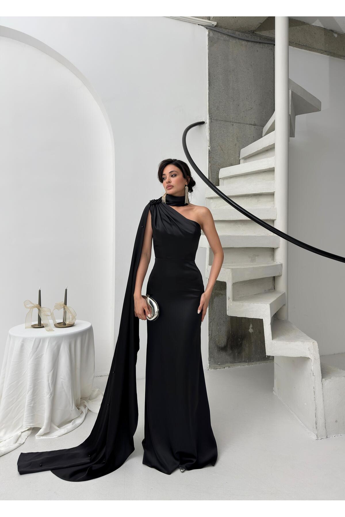 Siyah Tek Omuz Şal Detaylı Asimetrik Saten Abiye Elbise Siyah Tek Omuz Şal Detaylı Asimetrik Saten Abiye Elbise ST1099-1 44