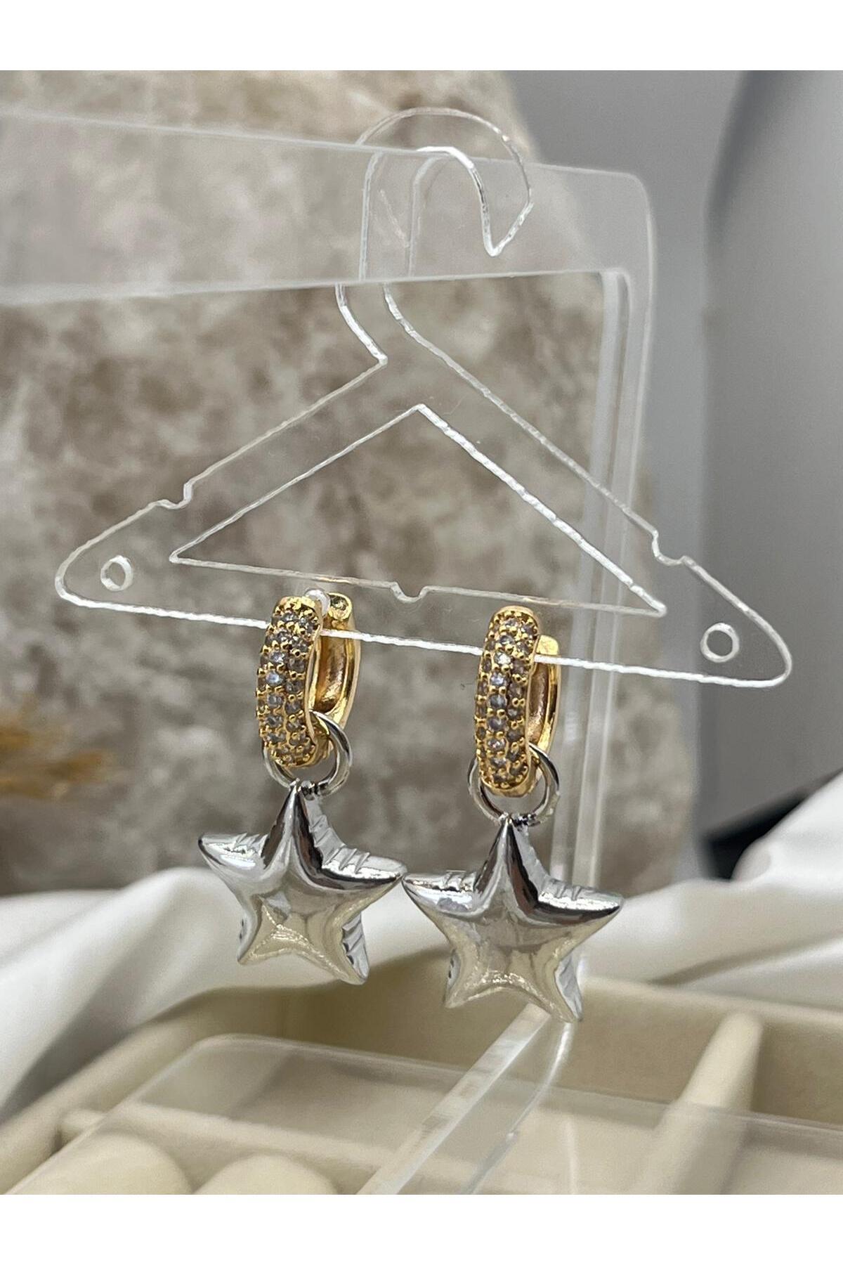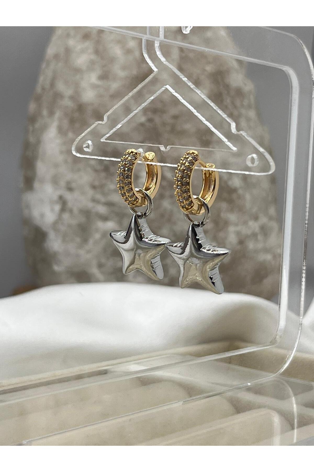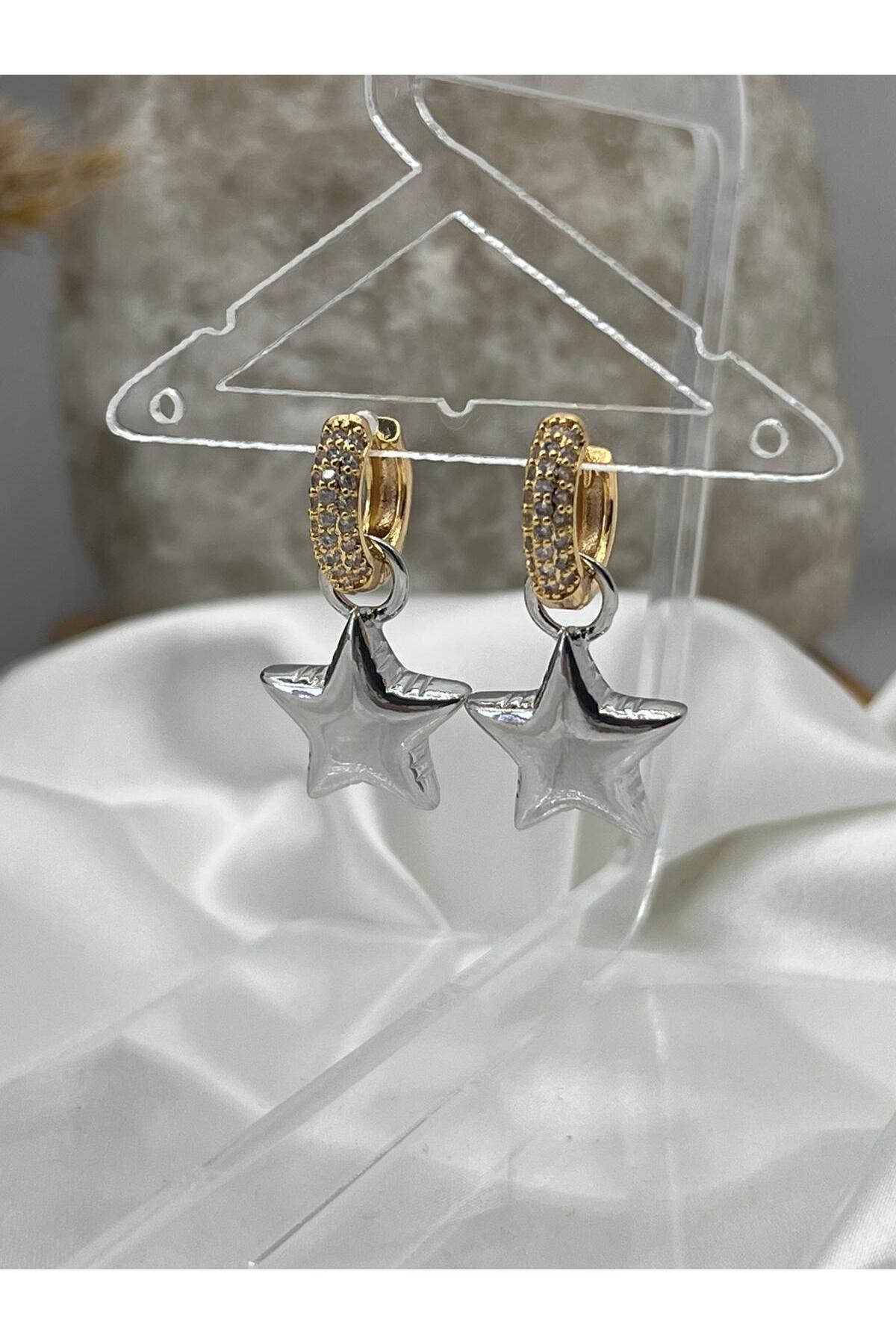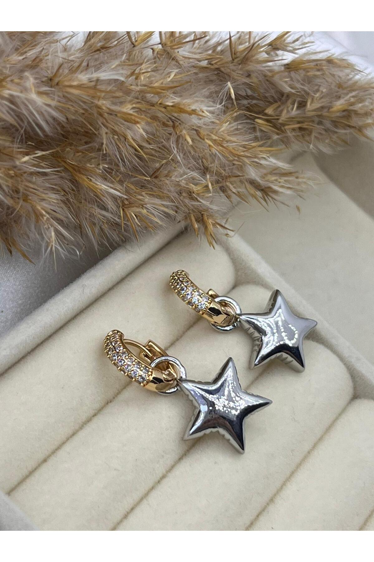 Zirkon Taşlı Altın Detaylı Gümüş Yıldız Çelik Küpe Zirkon Taşlı Altın Detaylı Gümüş Yıldız Çelik Küpe BY1GSS07010011 تک سایز