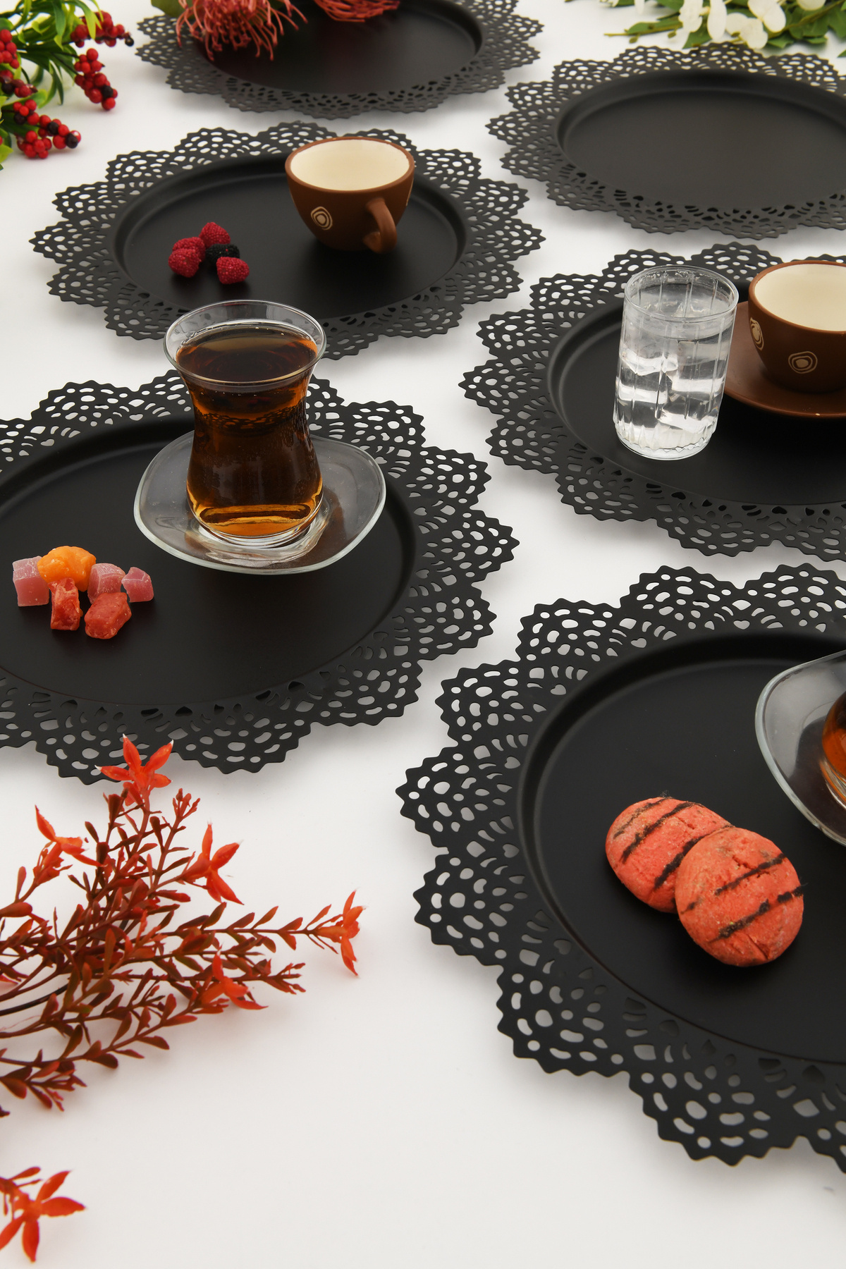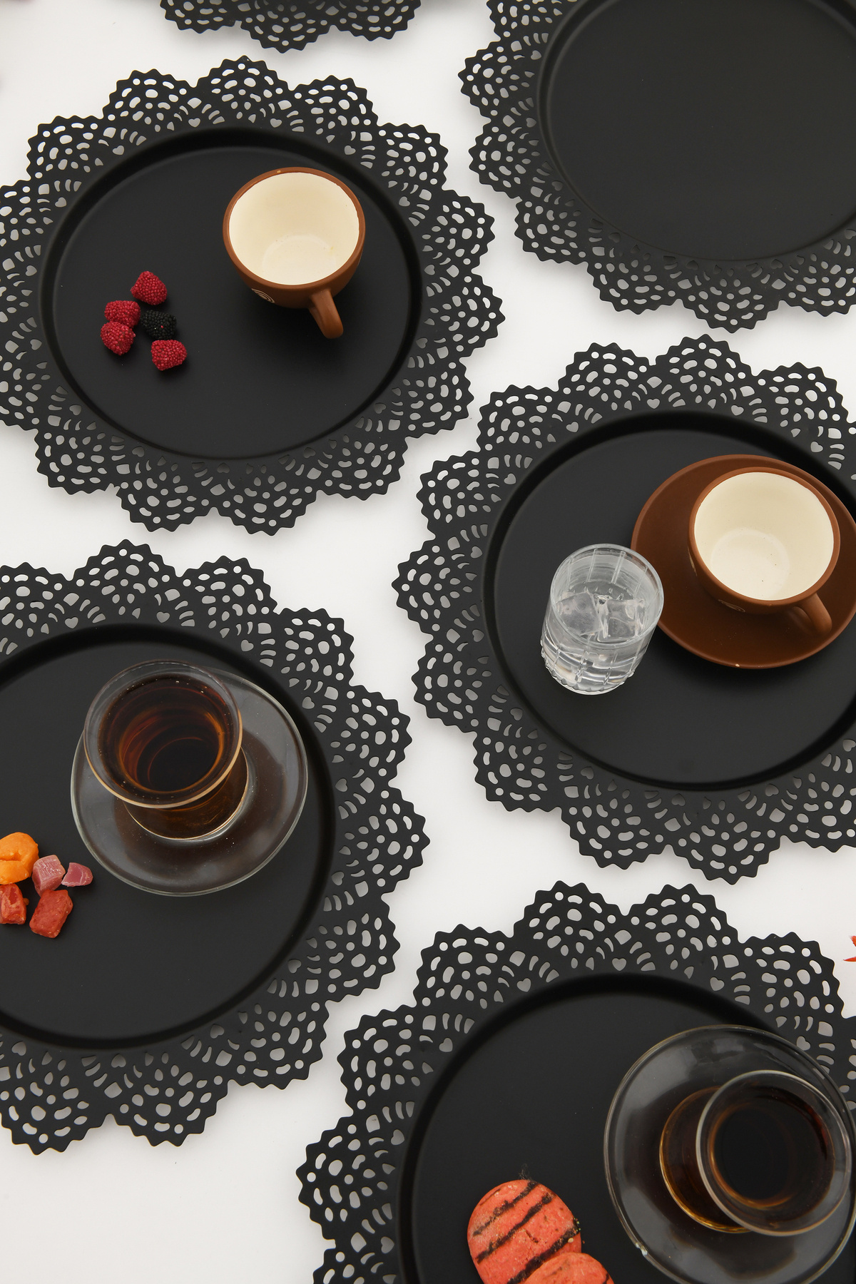 İsabel Siyah 6'lı Dantel Kenarlı Oyma Detaylı Yuvarlak Dekoratif Sunum Tepsisi İsabel Siyah 6'lı Dantel Kenarlı Oyma Detaylı Yuvarlak Dekoratif Sunum Tepsisi İSABEL 6 تک سایز